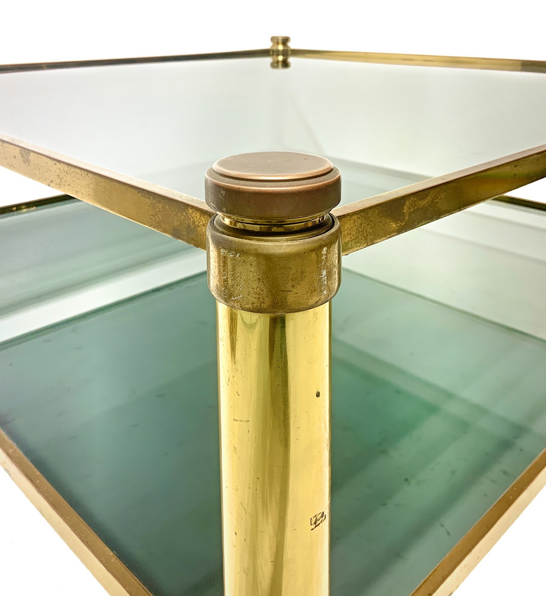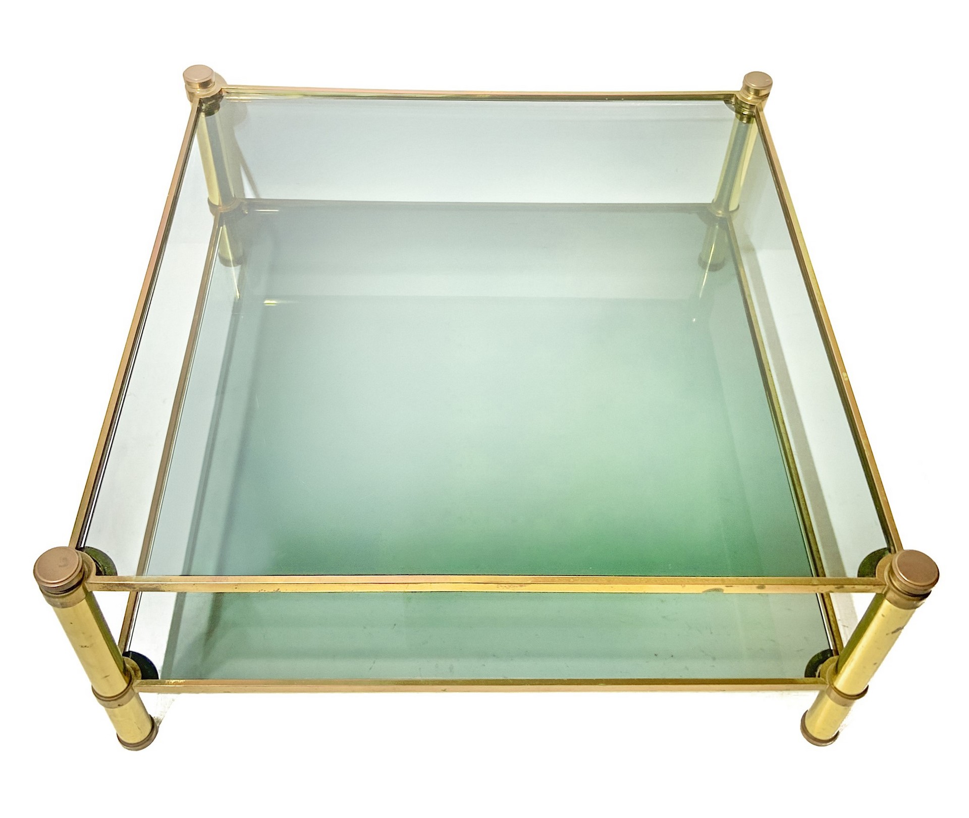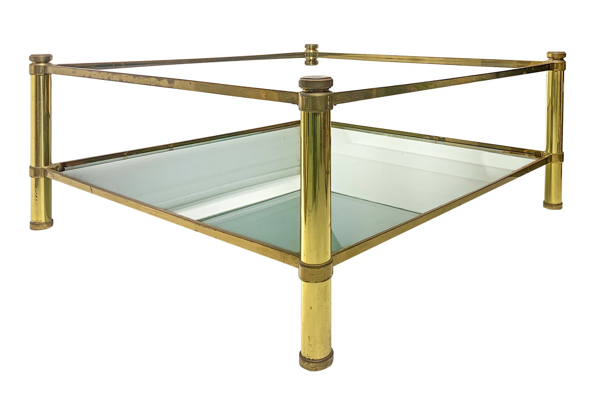 Tavolo da caffè nello stile di Romeo Rega 1,02x1,02 m Struttura in ottone dorato, piano in vetro color nero. Presenti segni d’uso.