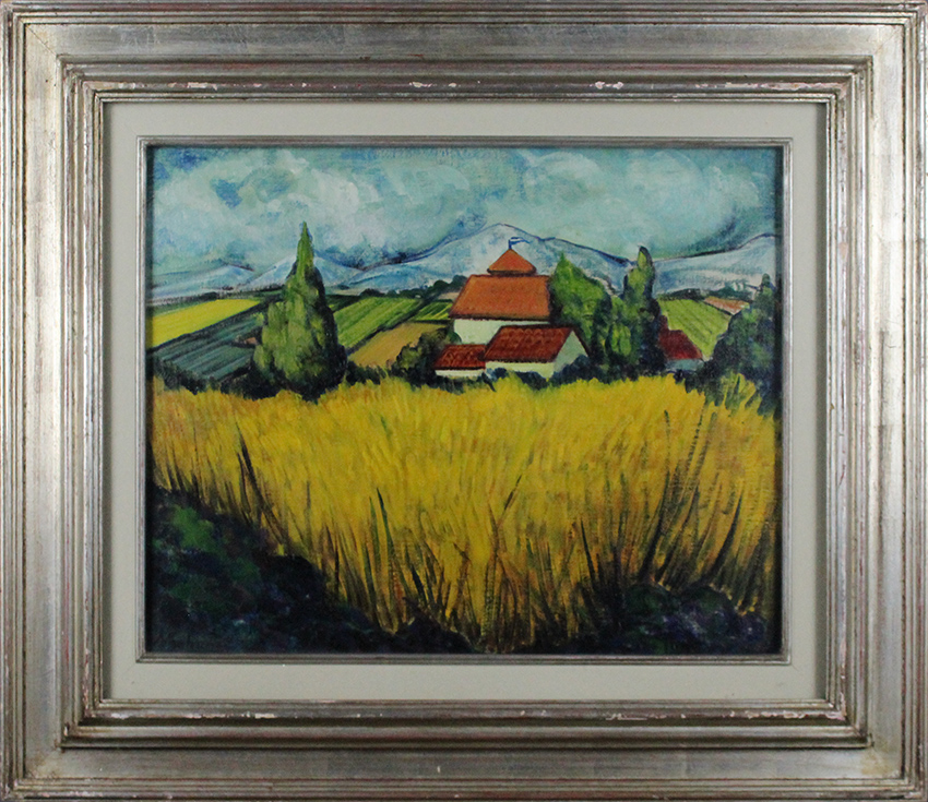 Emily Rohonci, "Paesaggio con grano", 1973, Olio su tela, Dim. 50x40, Al verso: etichetta e timbro con numero 2411 "Galleria Accademia" Torino, Al fronte: firmato in basso a destra