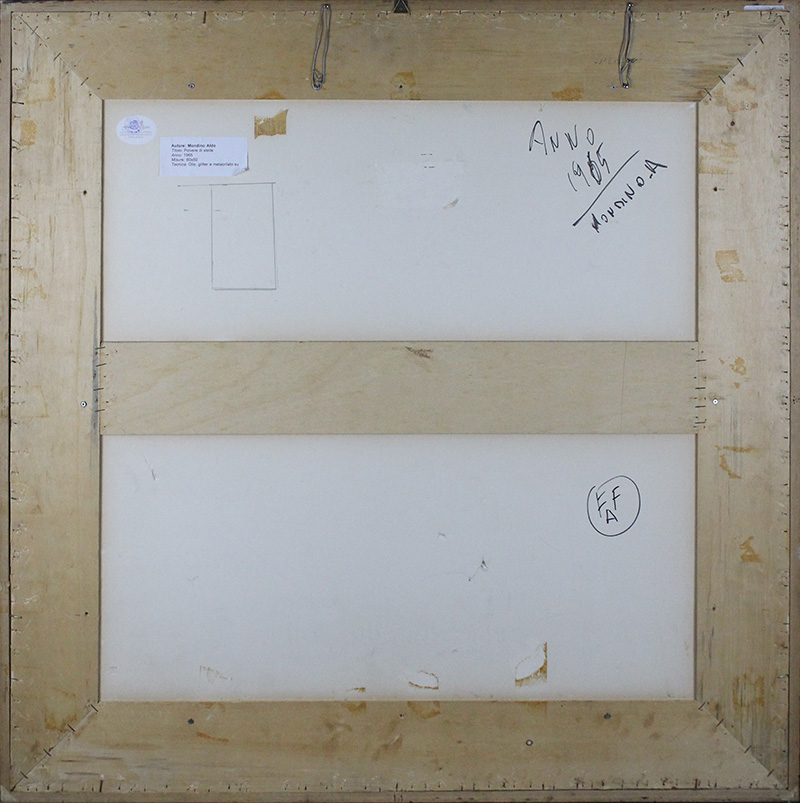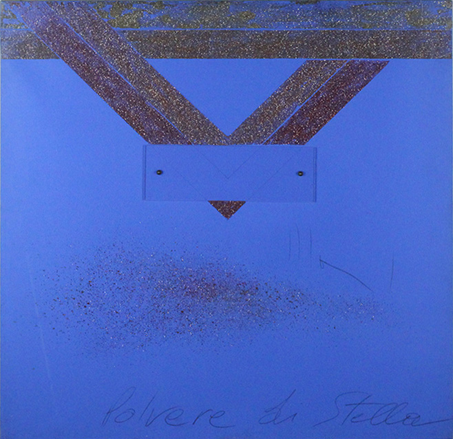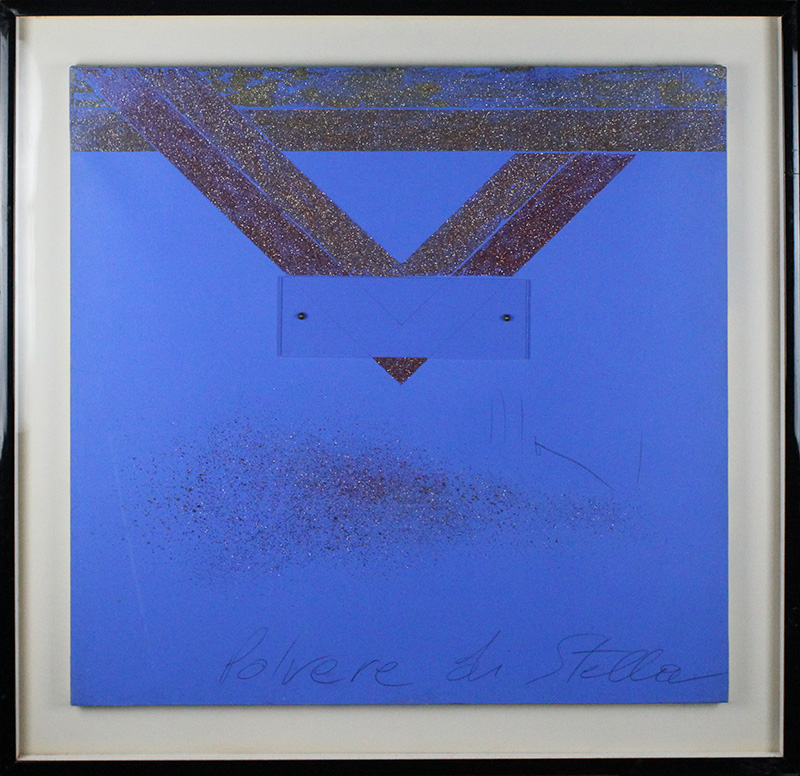 Aldo Mondino, "Polvere di stelle", 1965, Olio, glitter e metacrilato su tela, Dim. 80x80, Opera con autentica dell'Archivio Aldo Mondino con numero 20140107134442 in data 12 marzo 2014, Opera pubblicata : "Aldo Mondino. Catalogo generale vol. 1", Archivio Aldo Mondino, Allemandi, Torino 2017 pag. 165 ill. 5, Aldo Mondino "Ironicamente finalese", Finalborgo 2005, pag. 35, Esposizioni : Chiostro di Santa Caterina, Finalborgo 2005 Galleria Ulivi Prato, Provenienza: Galleria Ulivi Prato, Collezione Bruno Giraldi, Livorno, Al verso: etichetta e timbro dei Chiostri di Santa Caterina, Finalborgo data e firma, Al fronte: firma al centro e titolo in basso al centro