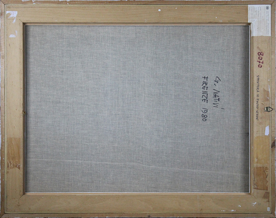 Gualtiero Nativi, "Struttura su fondo verde", 1980, Tempera / Acrilico intelata, Dim. 73x93, Opera con autentica dell’Archivio "Gualtiero Nativi" su foto con n° 8070, Al verso: etichetta Galleria il Ponte di Firenze 1989, titolo, data e firma, Al fronte: firmato in basso a sinistra