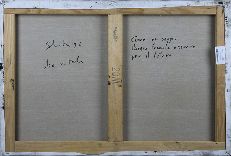 Beppe Schiavetta, "Come un saggio l'acqua feconda e scrive per il futuro", 1996, Olio e tecnica mista su tela, Dim. 50x73, Al verso: timbro di "Artfix" ,data, titolo, tecnica e firma