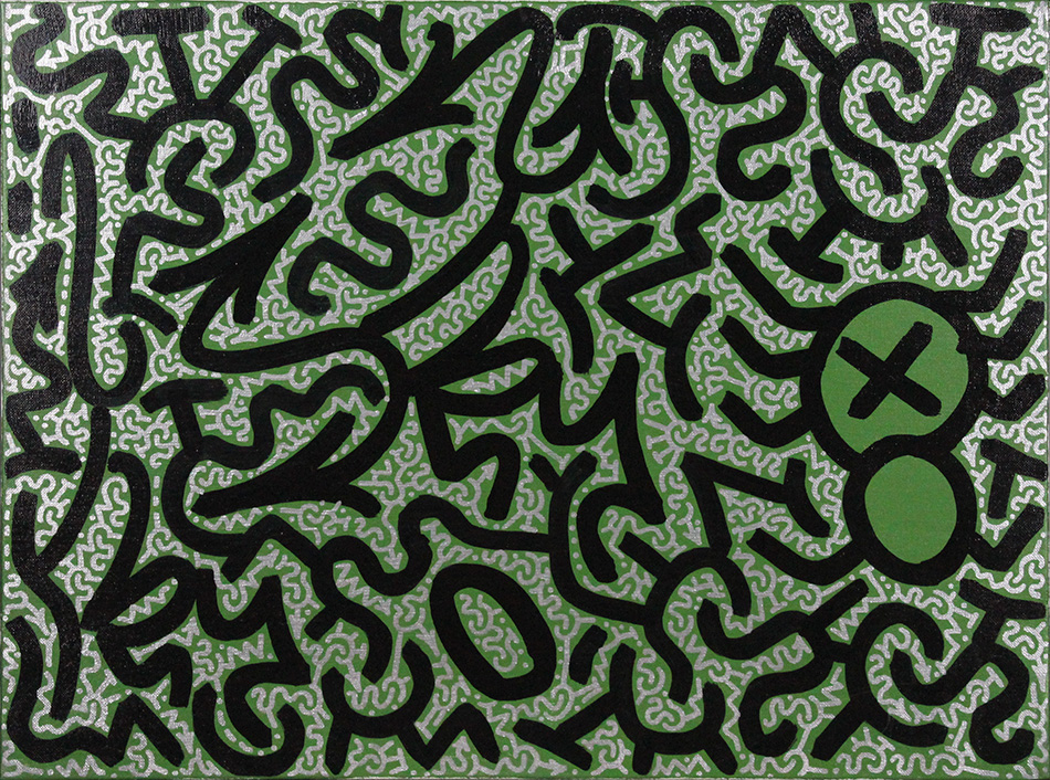Angel Ortiz, "One Green Bug", 2007, Olio e smalto su tela, Dim. 46x61, Opera accompagnata da autentica " Quadreria " e cerificato di autenticità rilasciato da " Rebecca Street Gallery " Bellaria in data 15/06/2008, Al verso: firmato