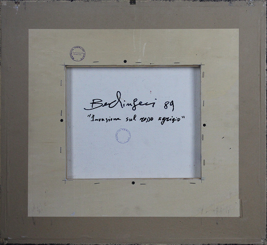 Cesare Berlingeri, " Invasione sul rosso e grigio", 1989, Olio su tela, Dim. 35x40, Opera accompagnata da autentica dell'Artista su foto e pubblicata, Al verso: timbro "Galleria Perlini Arte" Reggio Calabria, data, titolo e firma