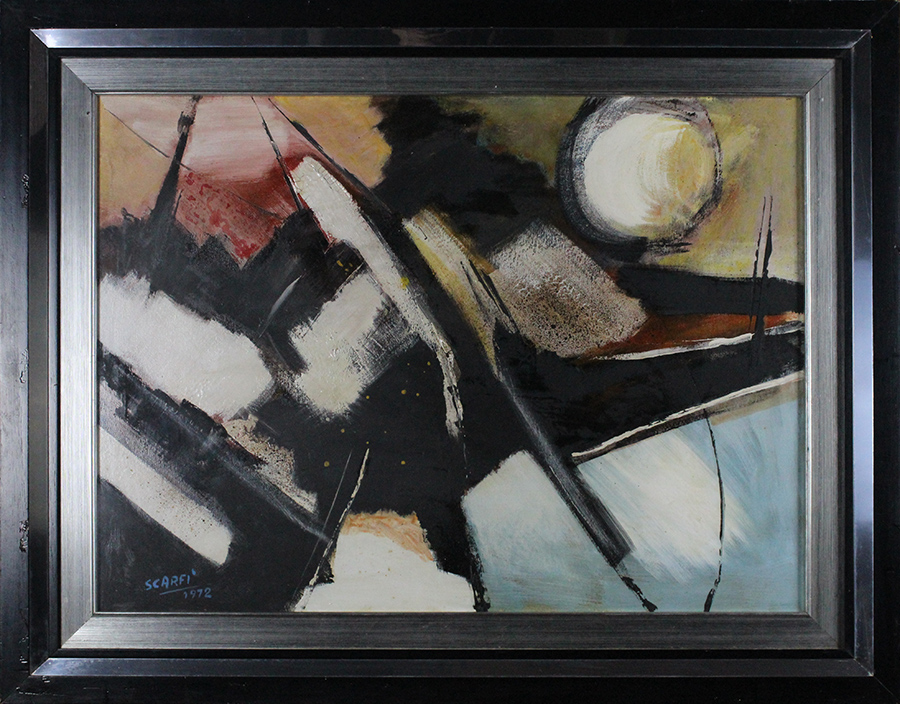 Attilio Scarfi, "Nello spazio", 1972, Olio su tela, Dim. 60x80, Al verso: etichetta e timbro con numero 1806 "Galleria Accademia" Torino, Al fronte: datato e firmato in basso a sinistra