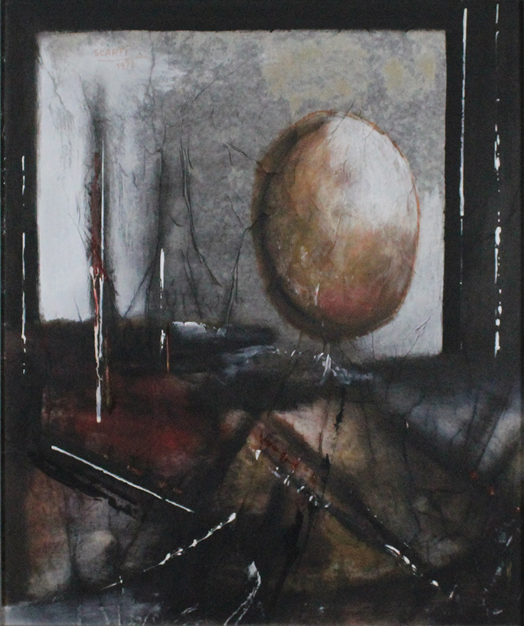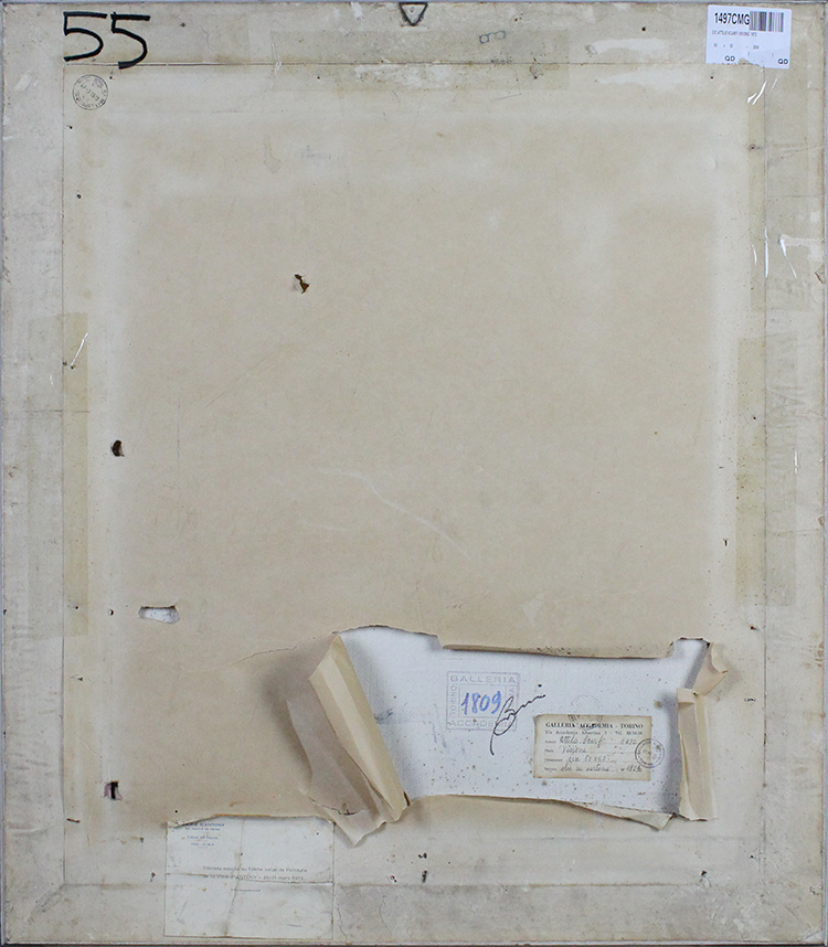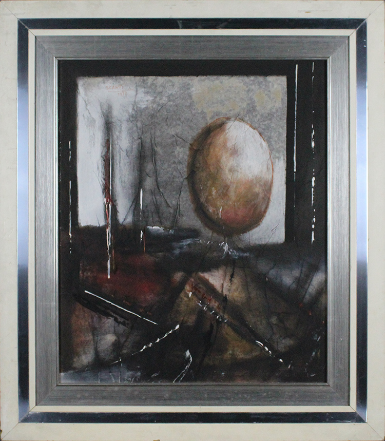 Attilio Scarfi, "Visione", 1972, Olio su tela, Dim. 60x50, Opera esposta dal 24 al 31 marzo 1973 al decimo salone della Peinture de la Ville d' Antony, Al verso: etichetta, timbro con numero 1809 "Galleria Accademia" Torino ed etichetta dell'esposizione