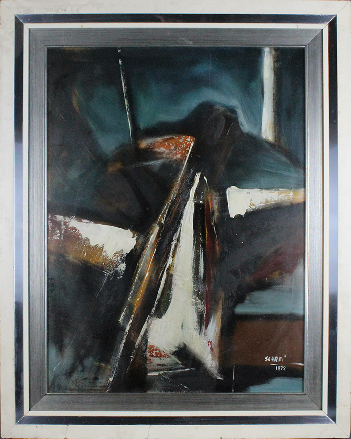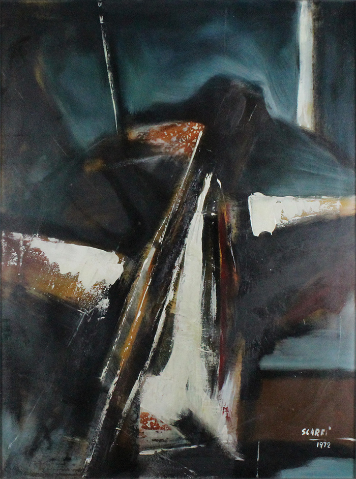 Attilio Scarfi, "Dall' alto", 1972, Olio su tela, Dim. 60x80, Al verso: etichetta e timbro con numero 1807 "Galleria Accademia" Torino, Al fronte: datato e firmato in basso a destra