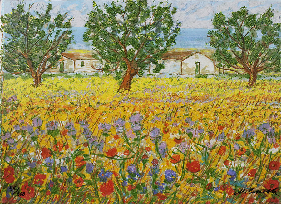 Michele Cascella, "Terra nativa",1984, Serigrafia su tela, Dim. 50x70, Al verso: certificato di autenticità, descrizione con autore, titolo, tecnica, anno ed edemplare n° 55/300, Al fronte: esemplare n° 55/300 in basso a sinistra e firmato in basso a destra, Solo telaio