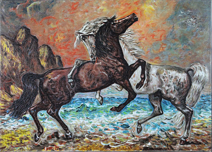 Giovan Francesco Gonzaga, "I due rivali", Serigrafia su tela, Dim. 50x70, Al verso: timbro di Gian Franco Gonzaga ed timbro con edizione MMVII "Arte", Al fronte: esemplare n° 80/250 in basso a destra, Solo telaio