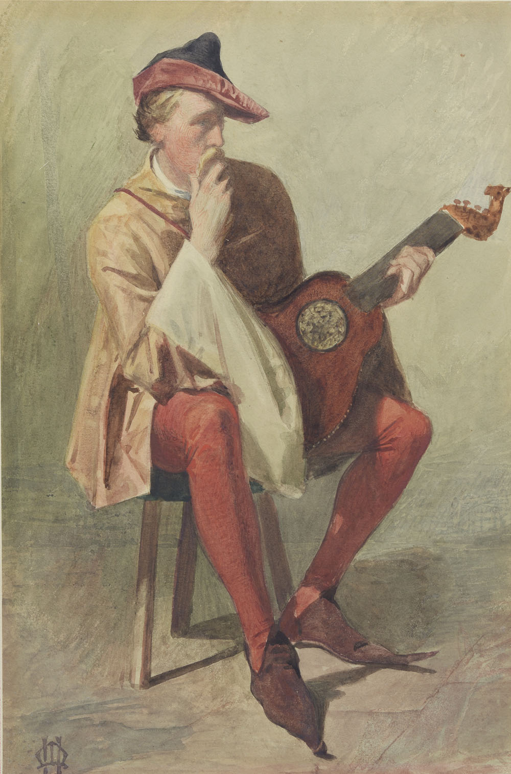 Scuola italiana del XIX secolo Menestrello Acquarello su carta incollata su...