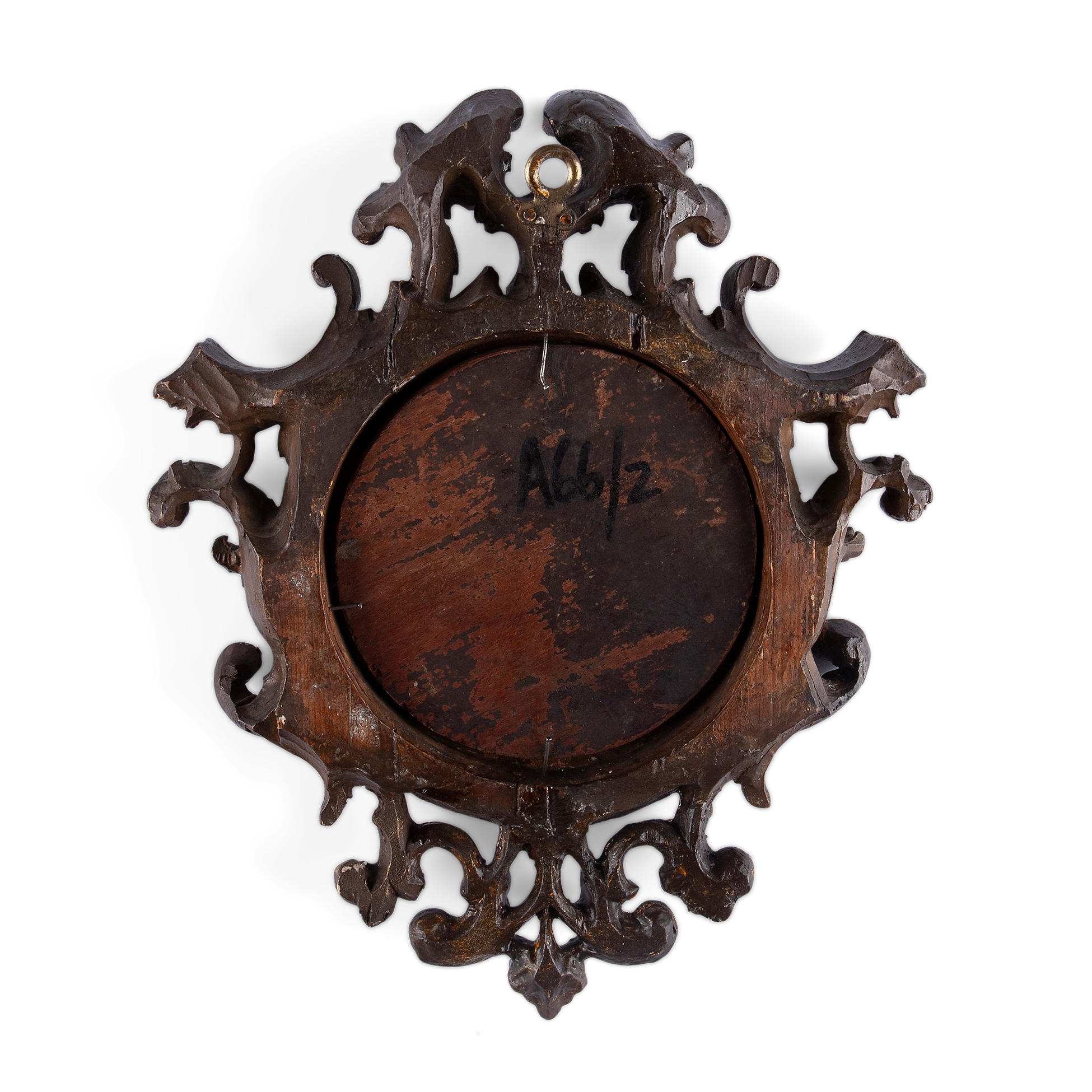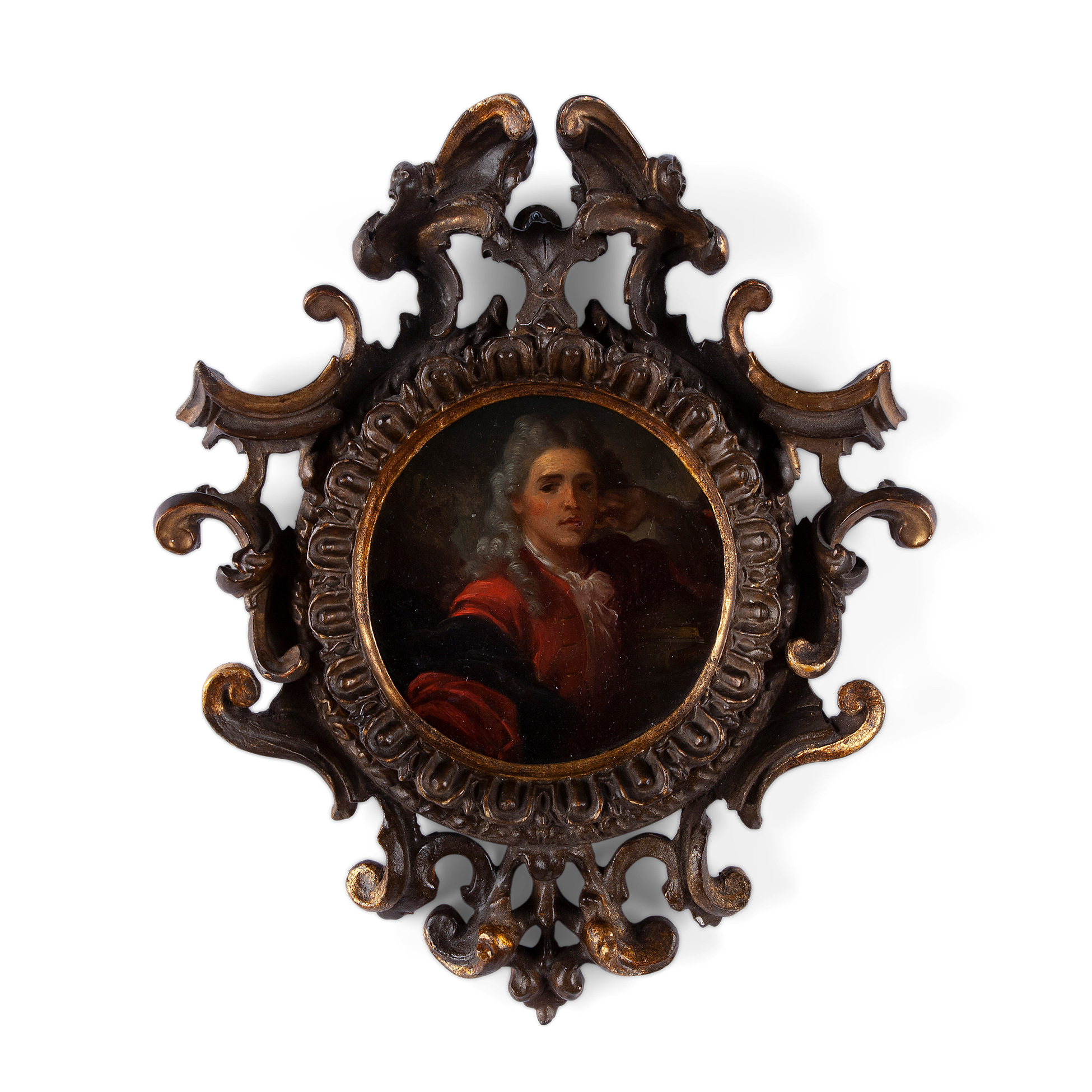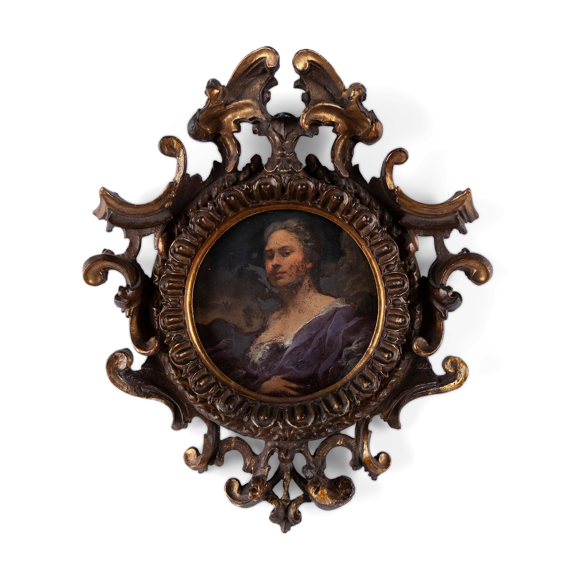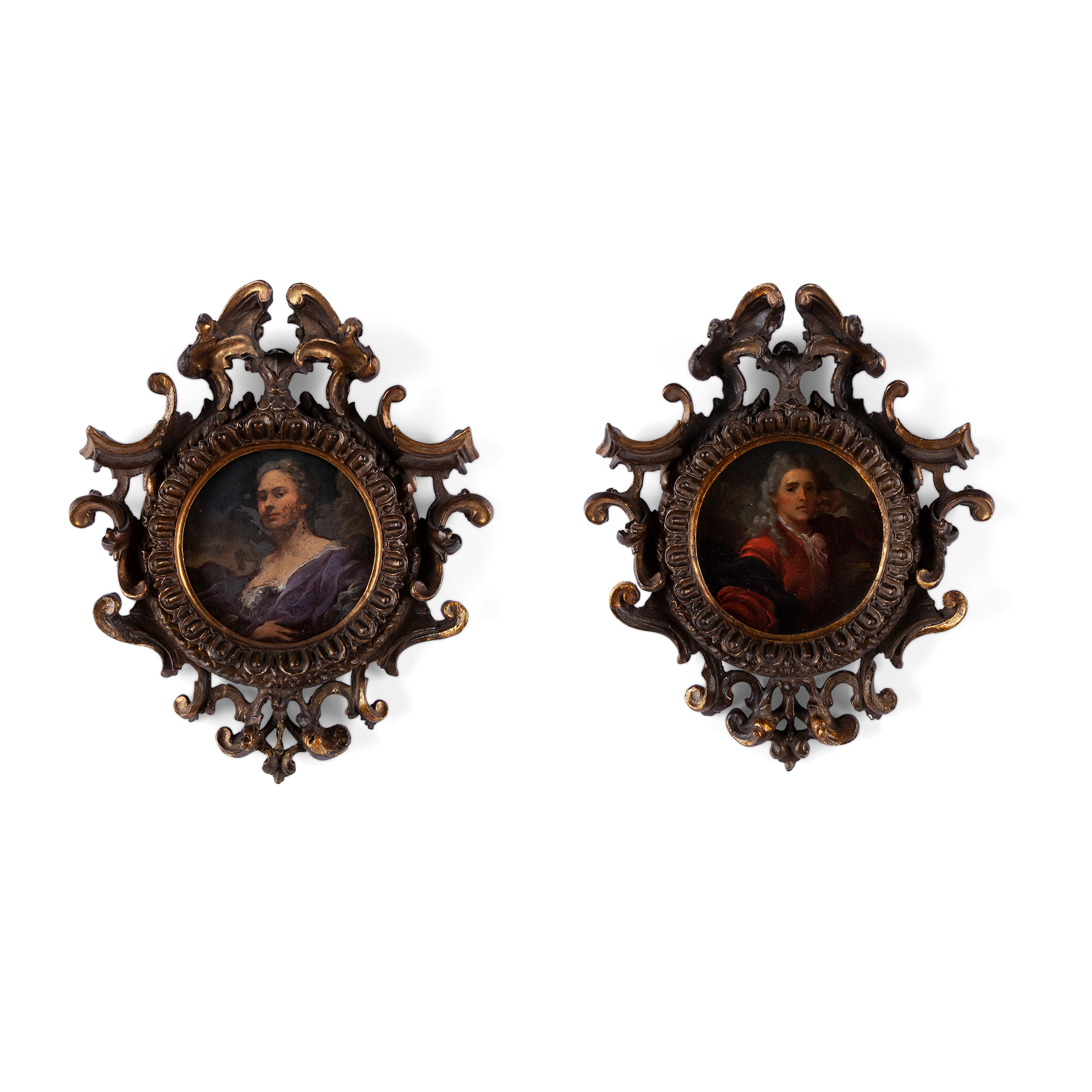 Coppia di miniature su tavoletta con ritratti di gentiluomo e gentildonna, Veneto o Emilia, XVIII secolo Bellissime cornici di epoca coeva in legno parzialmente dorato Dimensioni ext. 26,5x23, int. 12x12 cm. cad.