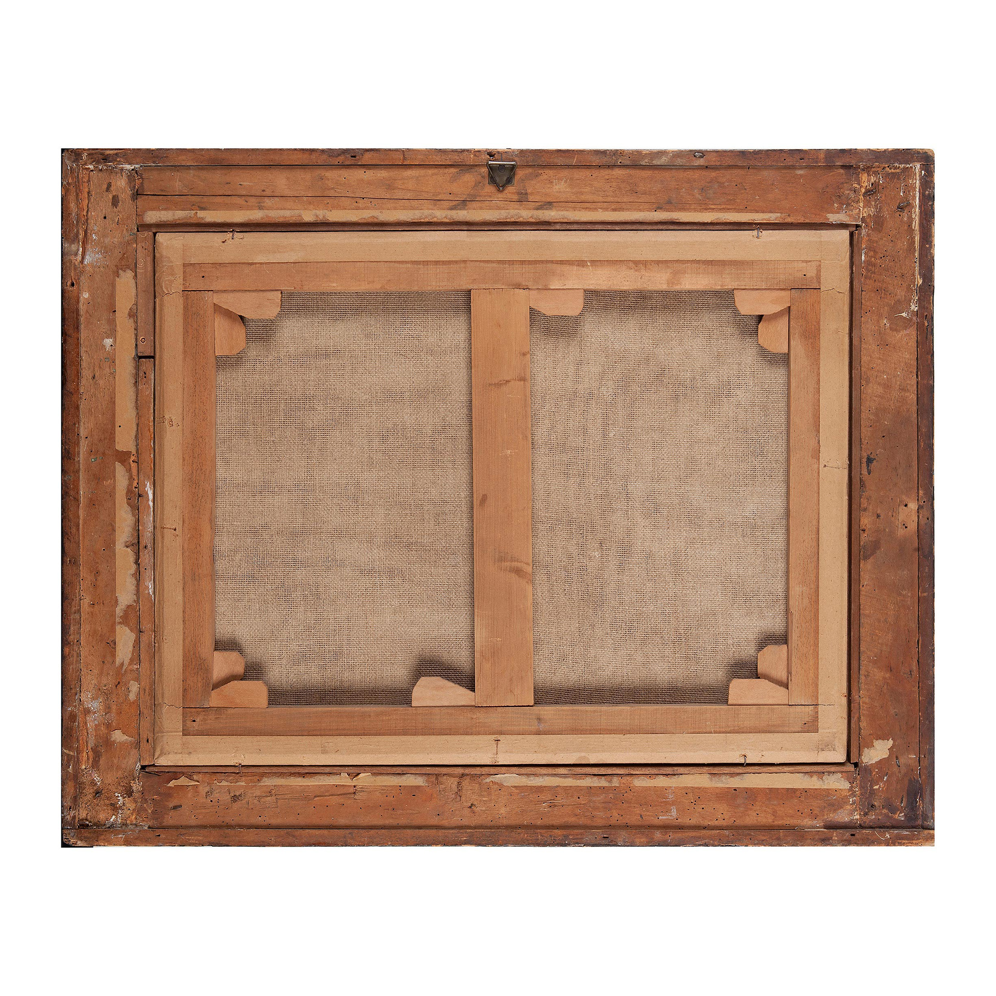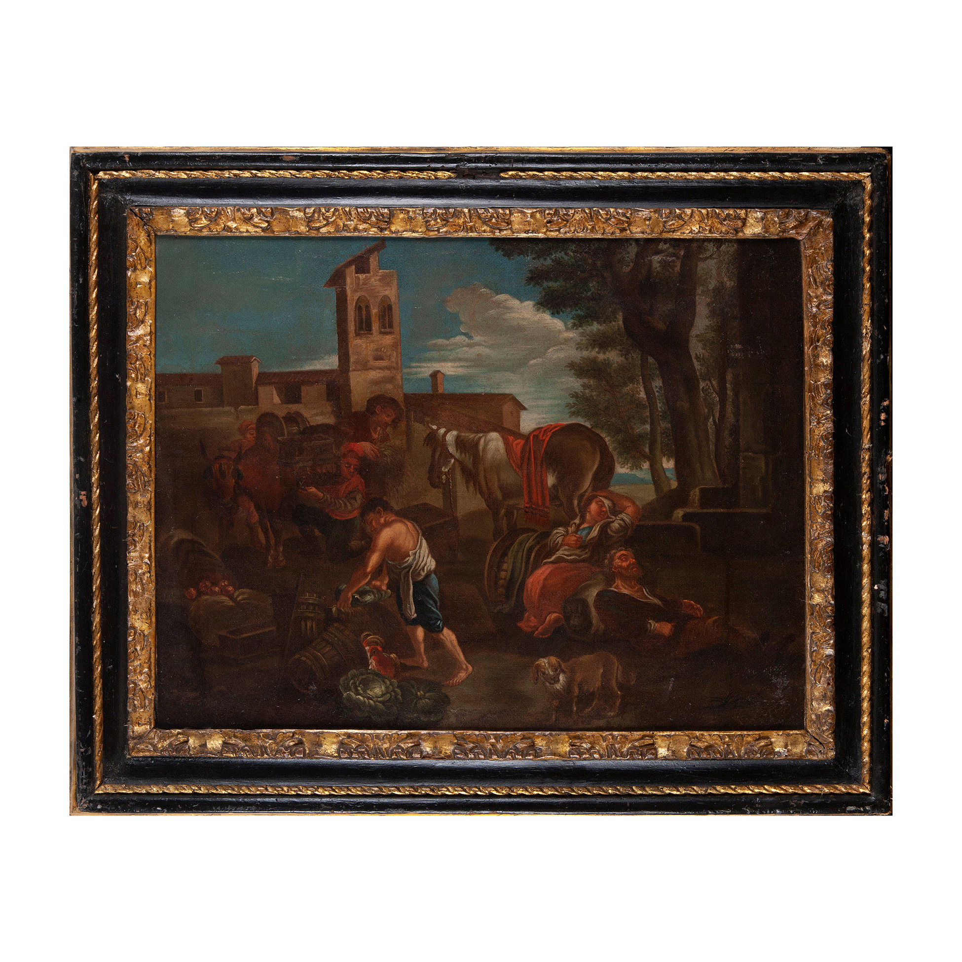 Pittore bambocciante del tardo XVII secolo, Riposo di viandanti Olio su tela, con cornice in legno con parti dorate Dimensioni ext. 64,5x80, int. 49,5x63,5 cm.