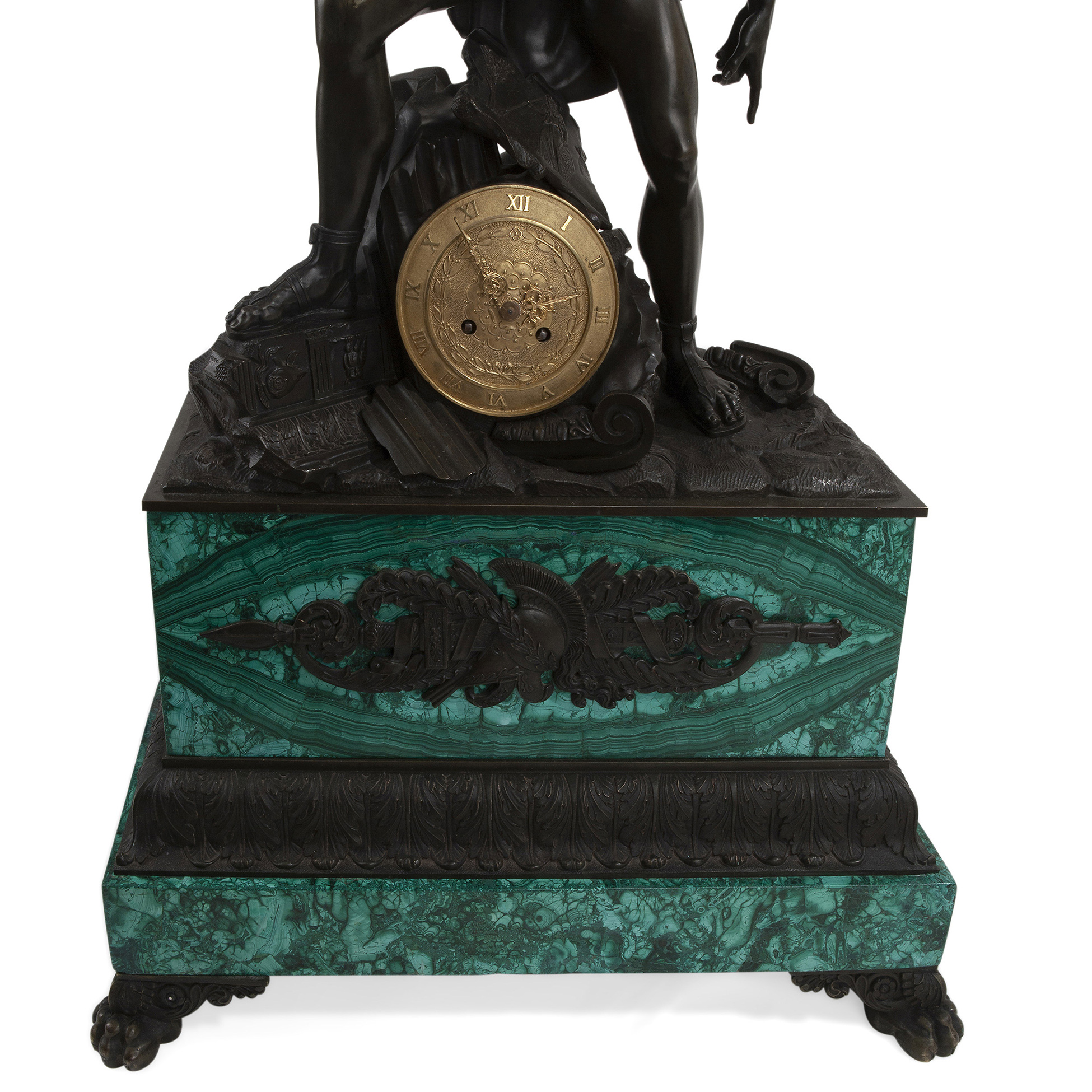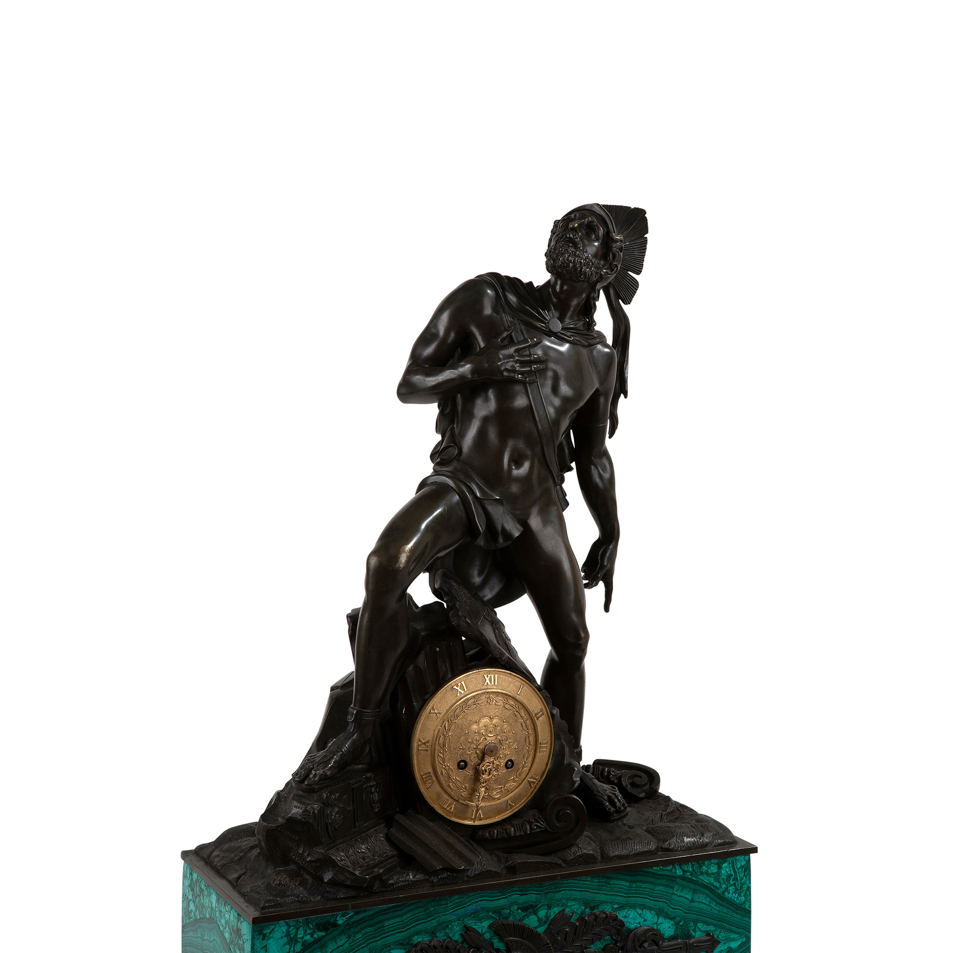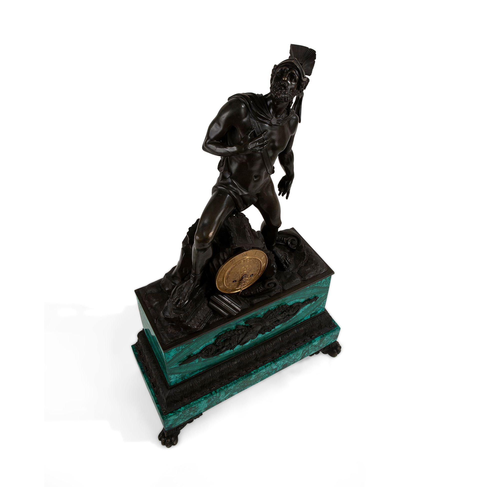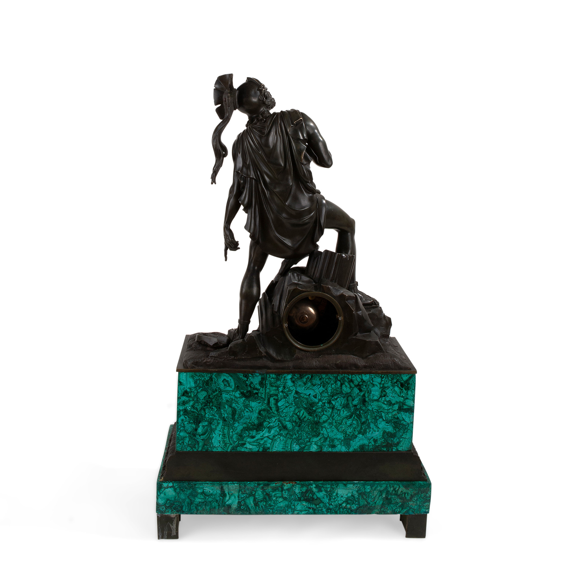 Orologio in bronzo brunito raffigurante un guerriero su rovine romane, Russia XIX secolo Base in malachite e bronzo brunito, quadrante con numeri romani Dimensioni 89x56x25 cm.