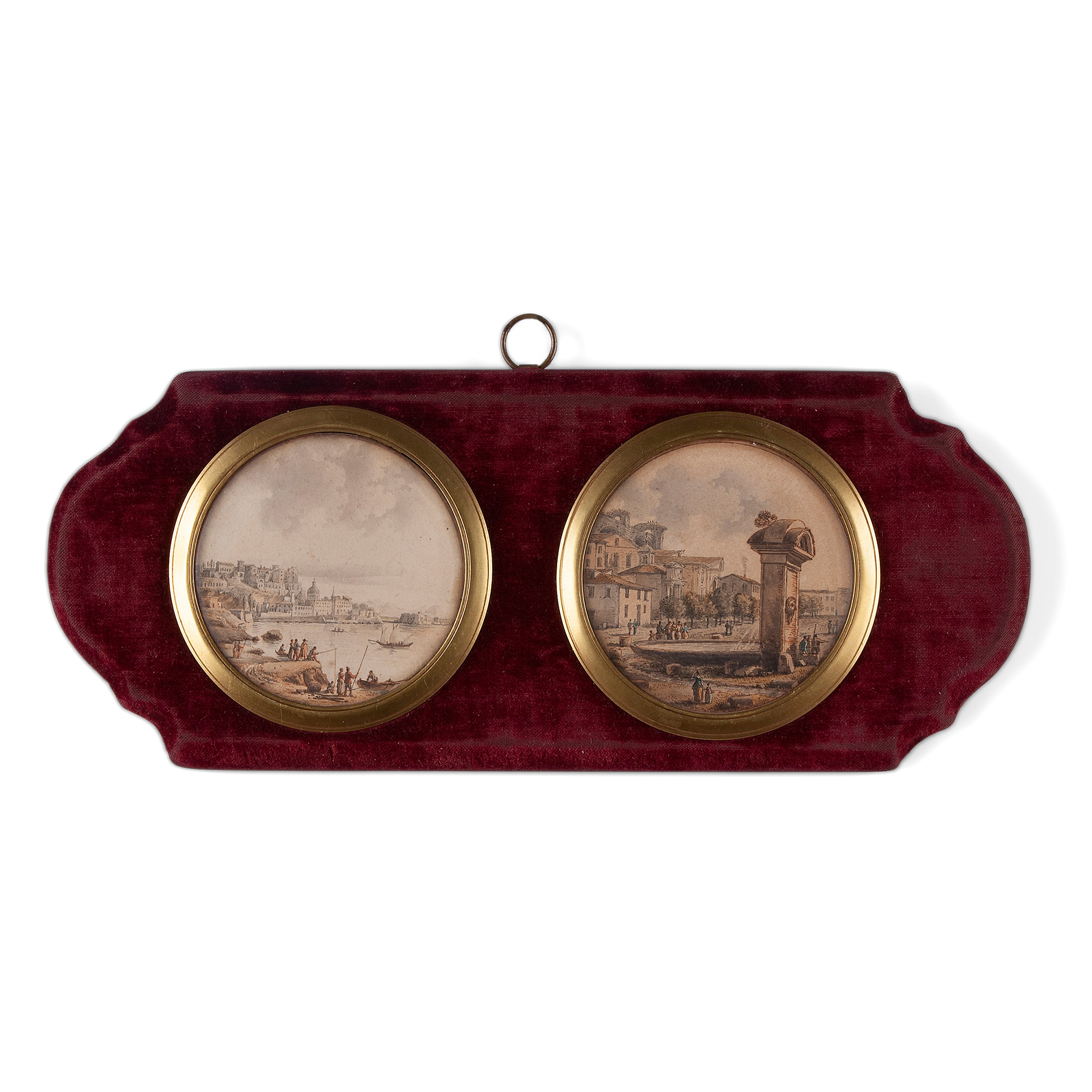 Due gouaches su carta raffiguranti una veduta di Napoli e una veduta di Roma, Francia fine XVIII inizi XIX secolo Attribuite a Victor Jean Nicolle (Parigi 1754-1826) Dimensioni ext. 10,5x26, int. diametro 7 cm. cad.