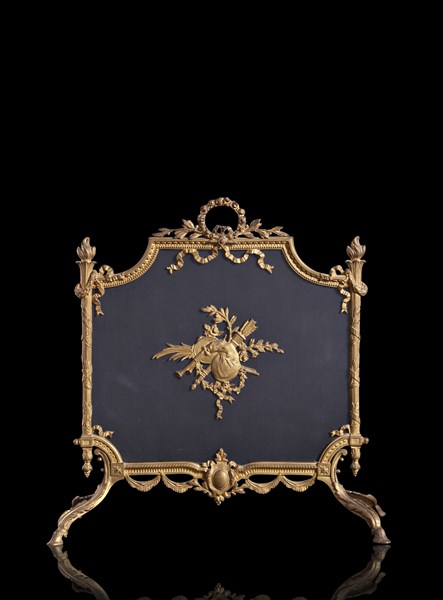 Parascintille in bronzo con cimasa traforata a ghirlanda floreale e montanti a fiaccole. Centrato da fregio a faretra e cornamusa. Piedi caprini (cm 65x75)