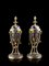 Coppia di candelieri in bronzo brunito e dorato decorati a volute fogliate e teste di ariete. Presa dei coperchi a guisa di pigna a tutto tondo (h. cm 30) (lievi difetti)