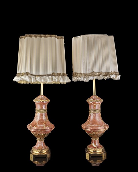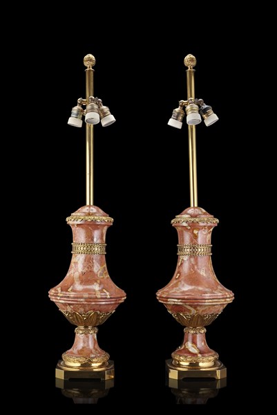 A pair of vase-shaped marble table lamps with gilt bronze base and mounts (h. cm 94) (defects)