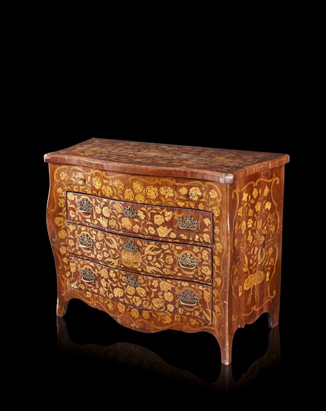 Commode di forma mossa intarsiata in legni vari a motivi floreali e fogliacei. Fronte a tre cassetti grandi e due piccoli. Secolo XIX (cm 122x91x55) (difetti, mancanze e restauri)