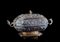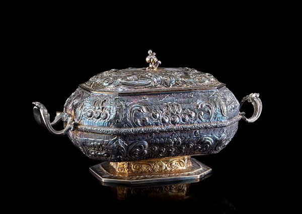 Zuppiera biansata di forma ottagonale in argento con interno in vermeille. Corpo riccamente sbalzato e cesellato a volute e fiori. Anse mosse e presa del coperchio a ricciolo a tutto tondo. Punzoni non decifrati (cm 41x21x18) (g 2420)