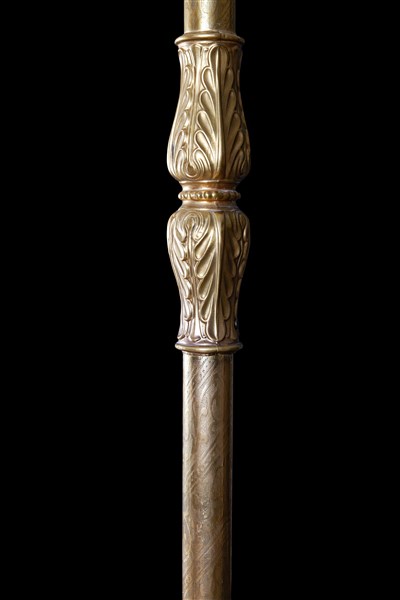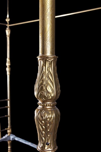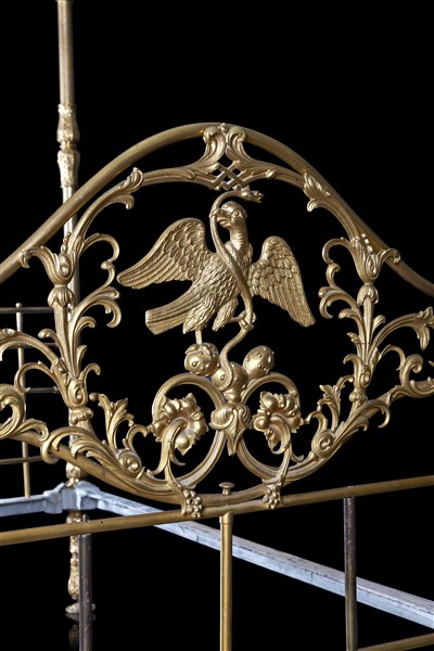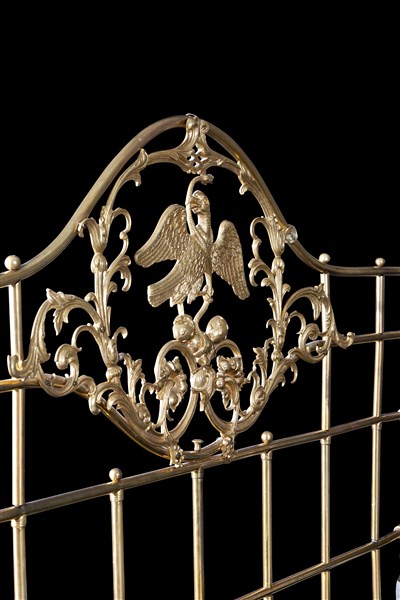 Letto a baldacchino in bronzo con testata e pediera decorate da fregi con Fenice che lotta col serpente, montanti incisi a volute e decorati da fregi cesellati a foglie d'acanto. Secolo XIX (cm 203x239x130) (difetti)