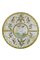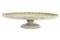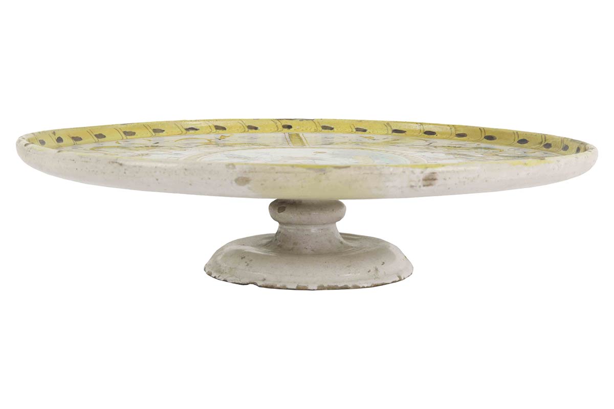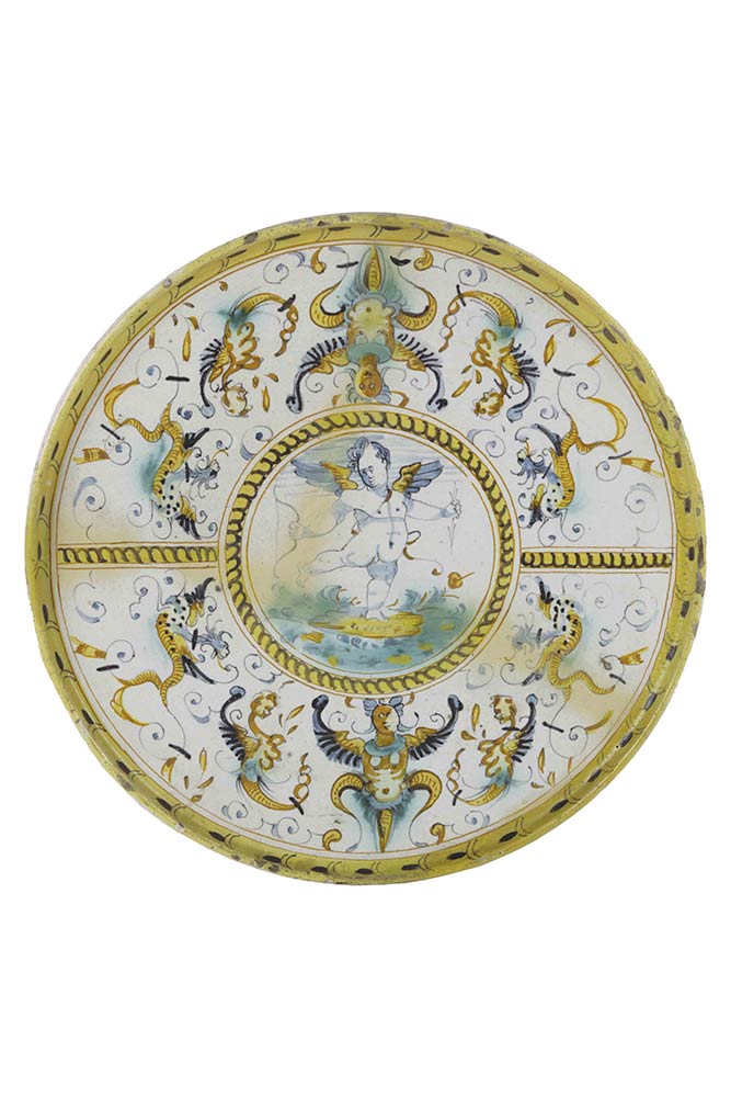Alzata in maiolica policroma con larga tesa decorata a grottesca divisa a metà da una linea così da rendere il decoro in due parti opposte; nel cavetto Amore che cavalca le onde su tavola nel mare con arco e frecce.
