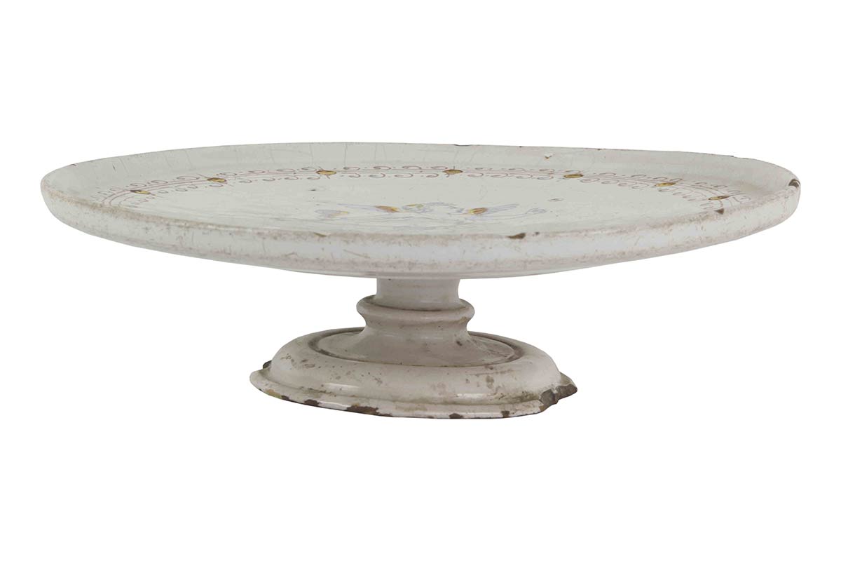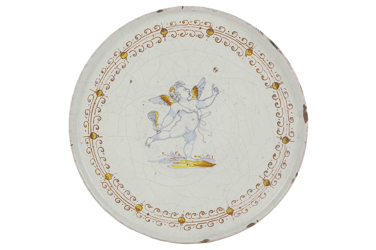 Alzata in maiolica di tipologia “compendiaria” con ghirlanda e al centro Amorino incedente verso destra, tenendo il viso a sinistra.