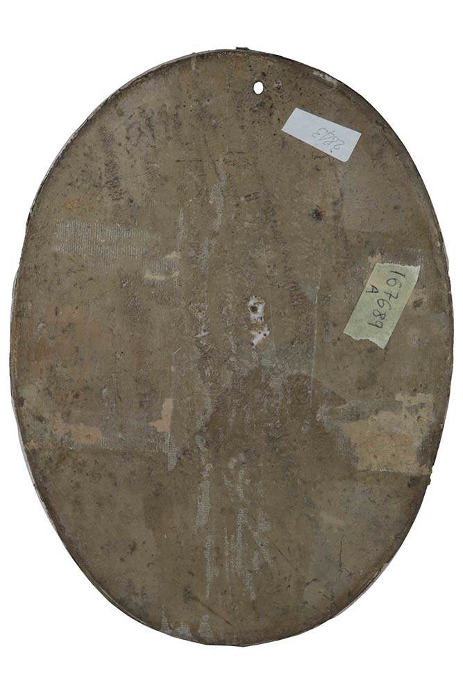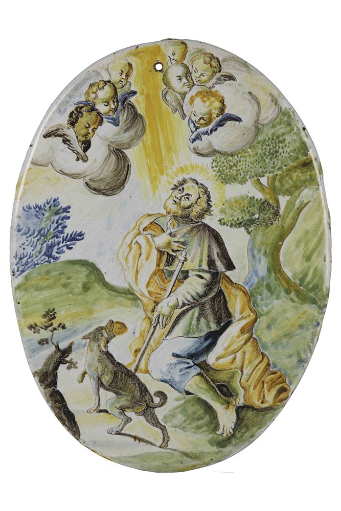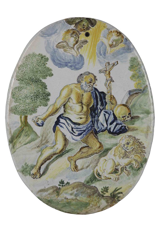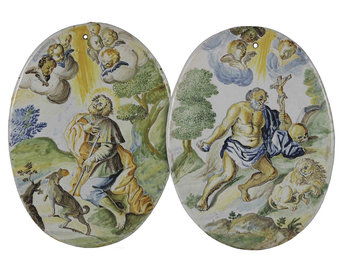 Coppia di tavolette ovali in maiolica policroma, dipinte a tutto campo con storie di Santi. Provenienza: collezione Piero Bonali (1903-1998) n°2843-2844