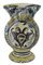 Boccaletto per misura di vino, con alta bocca espansa, corpo globulare su alto piede in maiolica policroma con rameggi fogliati in blu nel collo e nella pancia Emblema dell’Aquila bicipide in scuro di manganese col capo d’oro, fra rameggi blu entro riserva in giallo con registri verticali decorati a linee ondulate; nel collo del piede cerchi blu. Maiolica stemmata per esportazione nei paesi sotto il dominio asburgico.