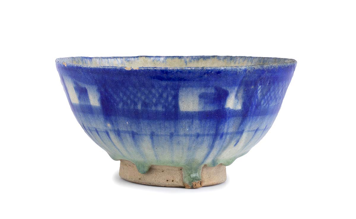 Tazza a ad ampio corpo svasato, coperta da vetrina alcalina suddipinta all'esterno in blu a motivi geometrici. Interno a spessa vetrina tendente al grigio pallido. Appoggio ad anello nudo con attorno vetrina raggrumata.
