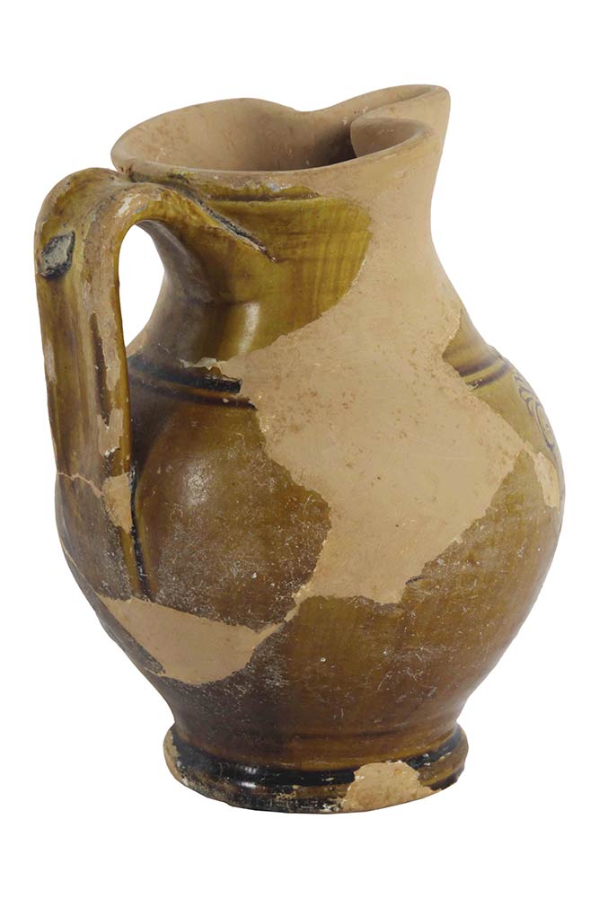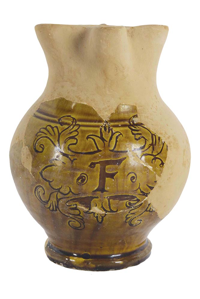 Boccale ricostruito da frammenti, che tuttavia permettono di distinguerne l’uso mediante la lettera al centro, una semplice “F”. Essa indicava l’infermeria (in antico “Fermeria”) per la cura degli infermi. La brocchetta conteneva evidentemente un farmaco liquido. La lettera si trova al centro della pancia contornata da svolazzi di vario genere, sempre di grande eleganza.