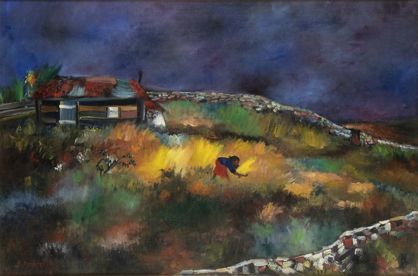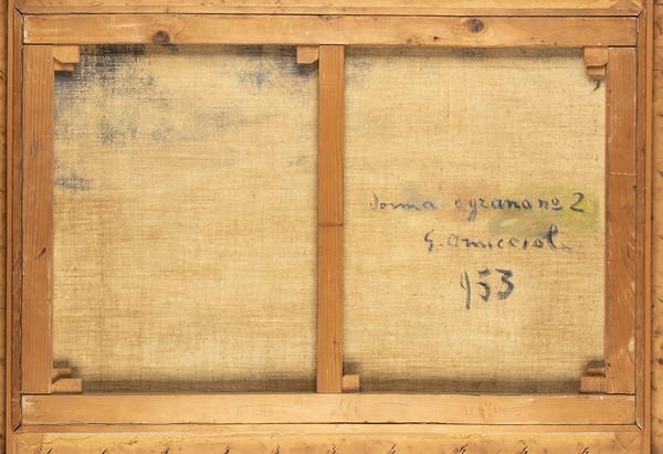 Firmato in basso a sinistra “G. Omiccioli”, al retro titolato, firmato e datato: “Donna e Grano n. 2, G. Omiccioli, 1953”