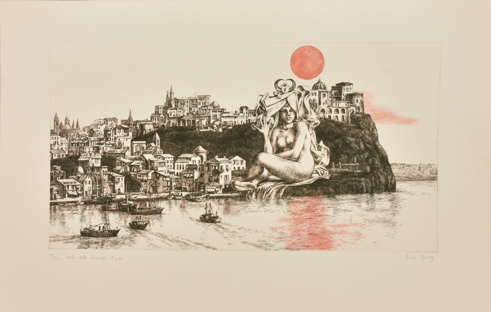Rudi Gorog ISOLA DELLE LUCERTOLE D'ORO incisione su carta, battuta cm 35,5x...