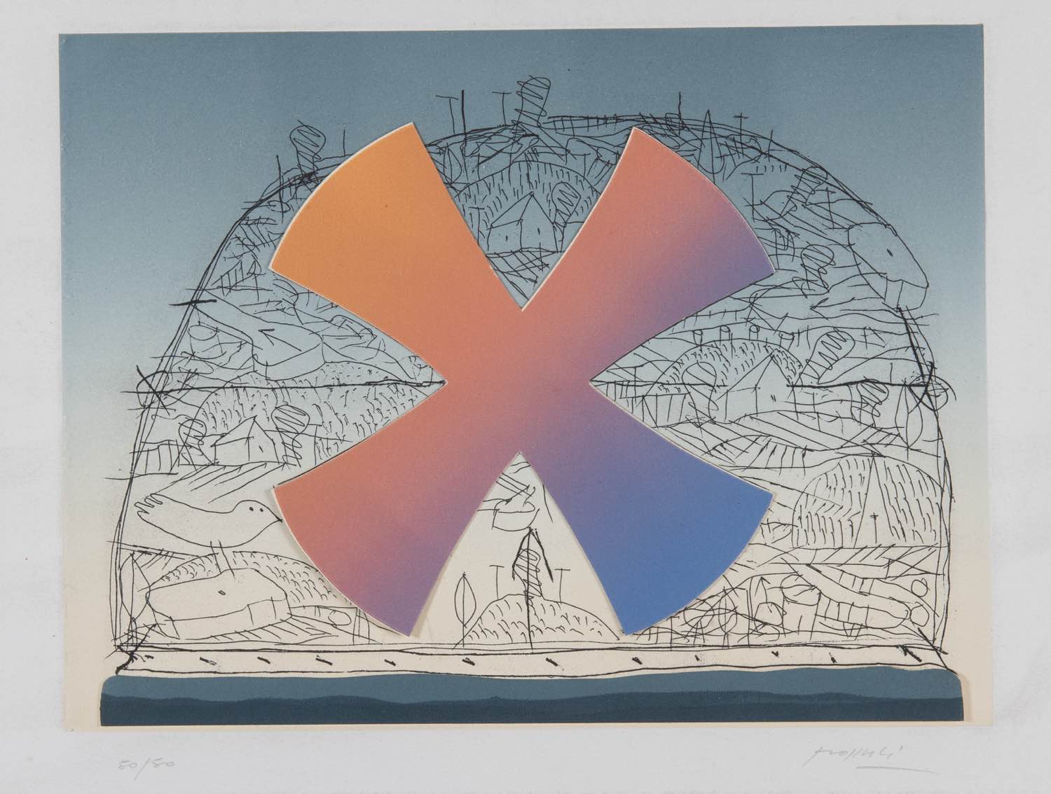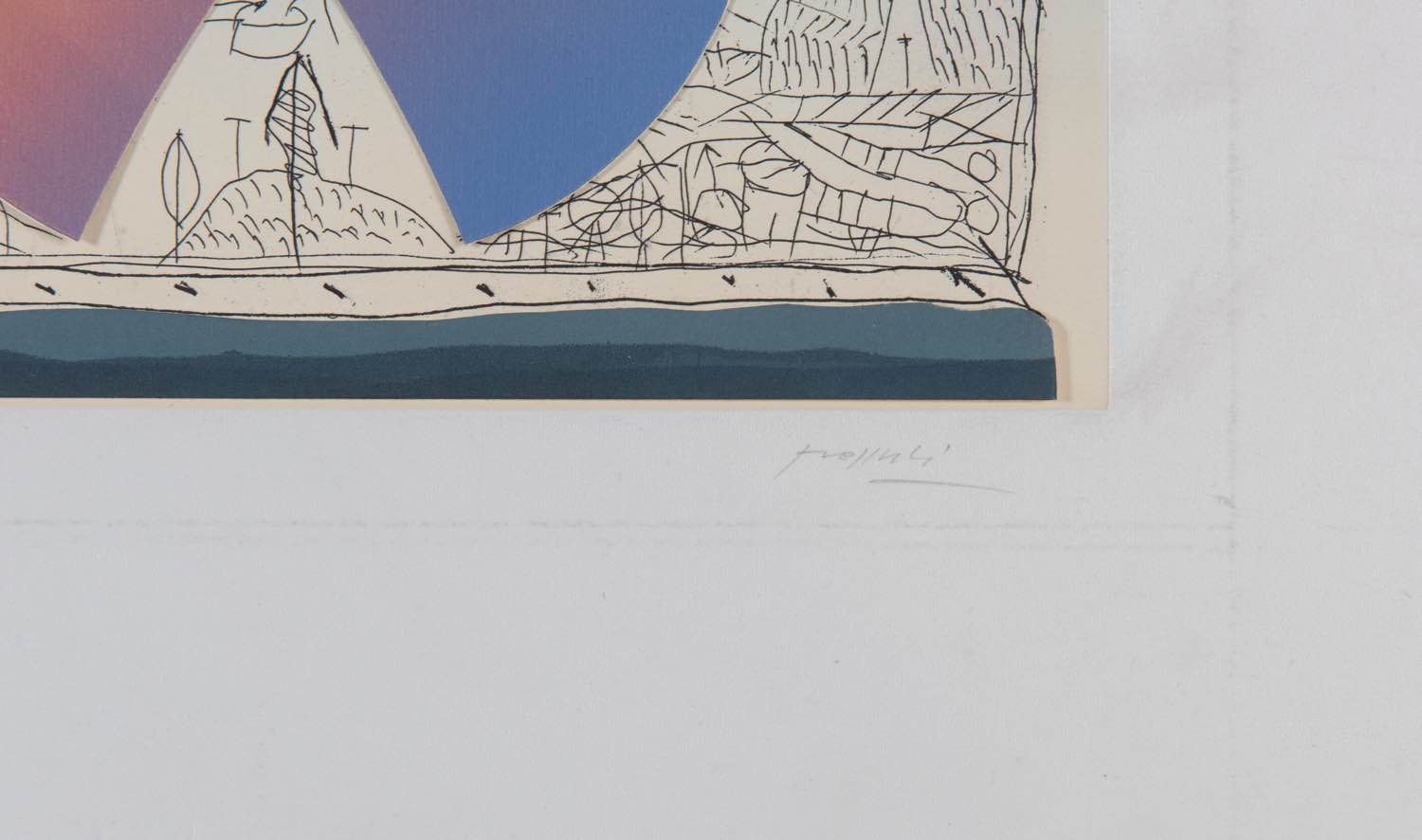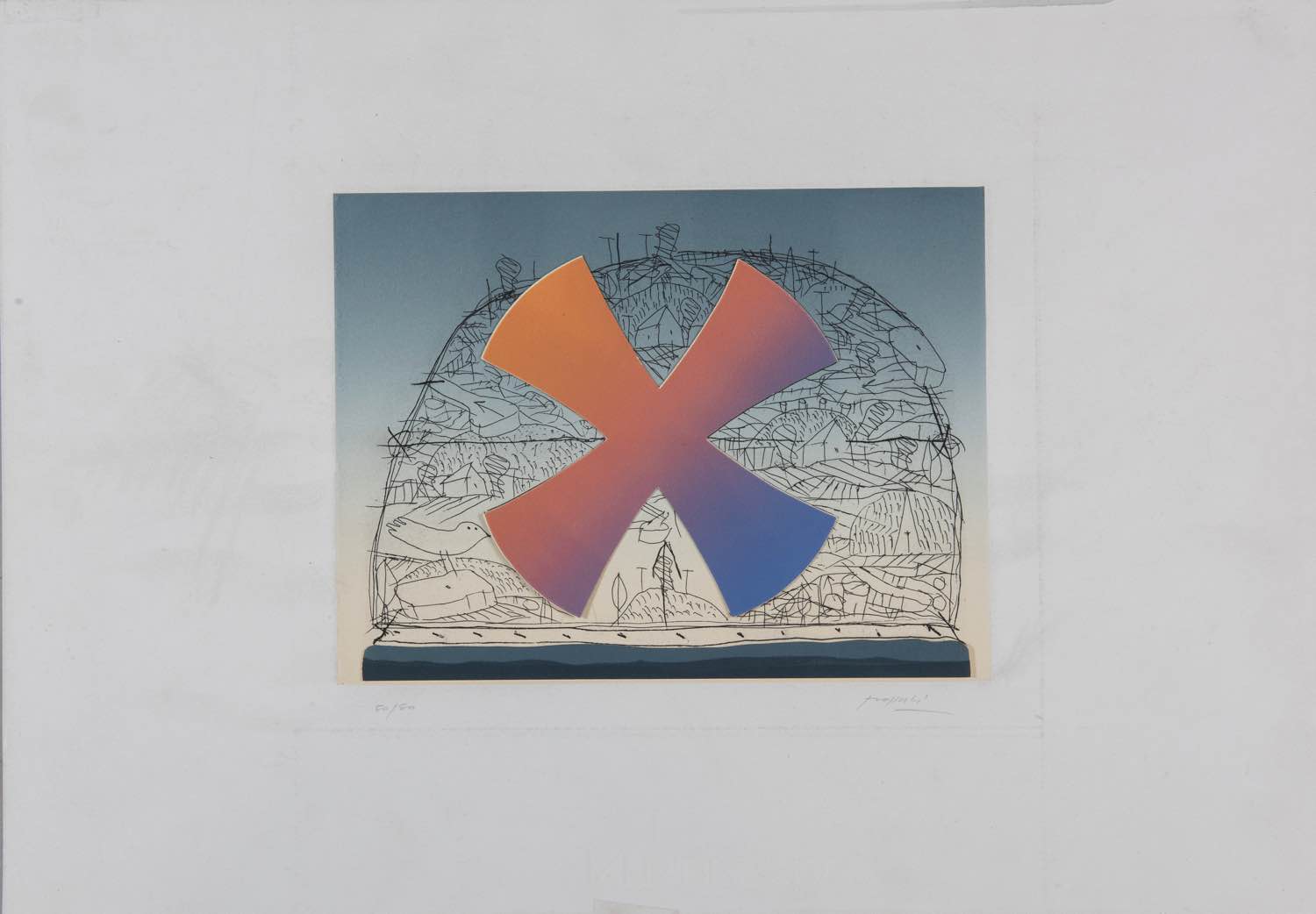 Incisione a colori e collage su carta, firmato in basso a destra Pozzati, numero di tiratura in basso a sinistra 50/50, Foglio H cm 94.5x65 - Lastra H cm 68x44