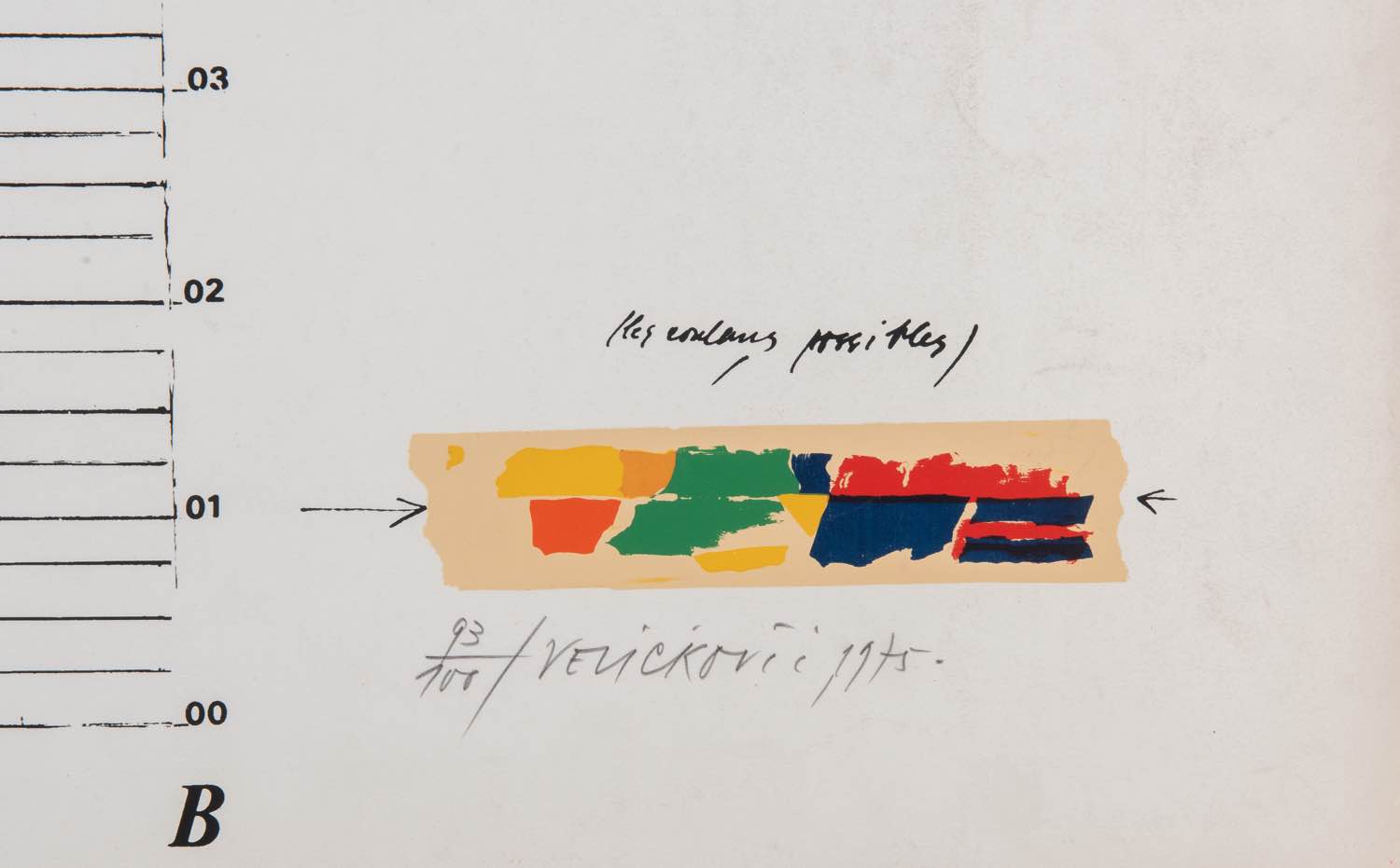 Litografia a colori su cartoncino, firmata, datata e numerata in basso a destra 93/100/Veličković, 1975, H cm 71x101 (usure)