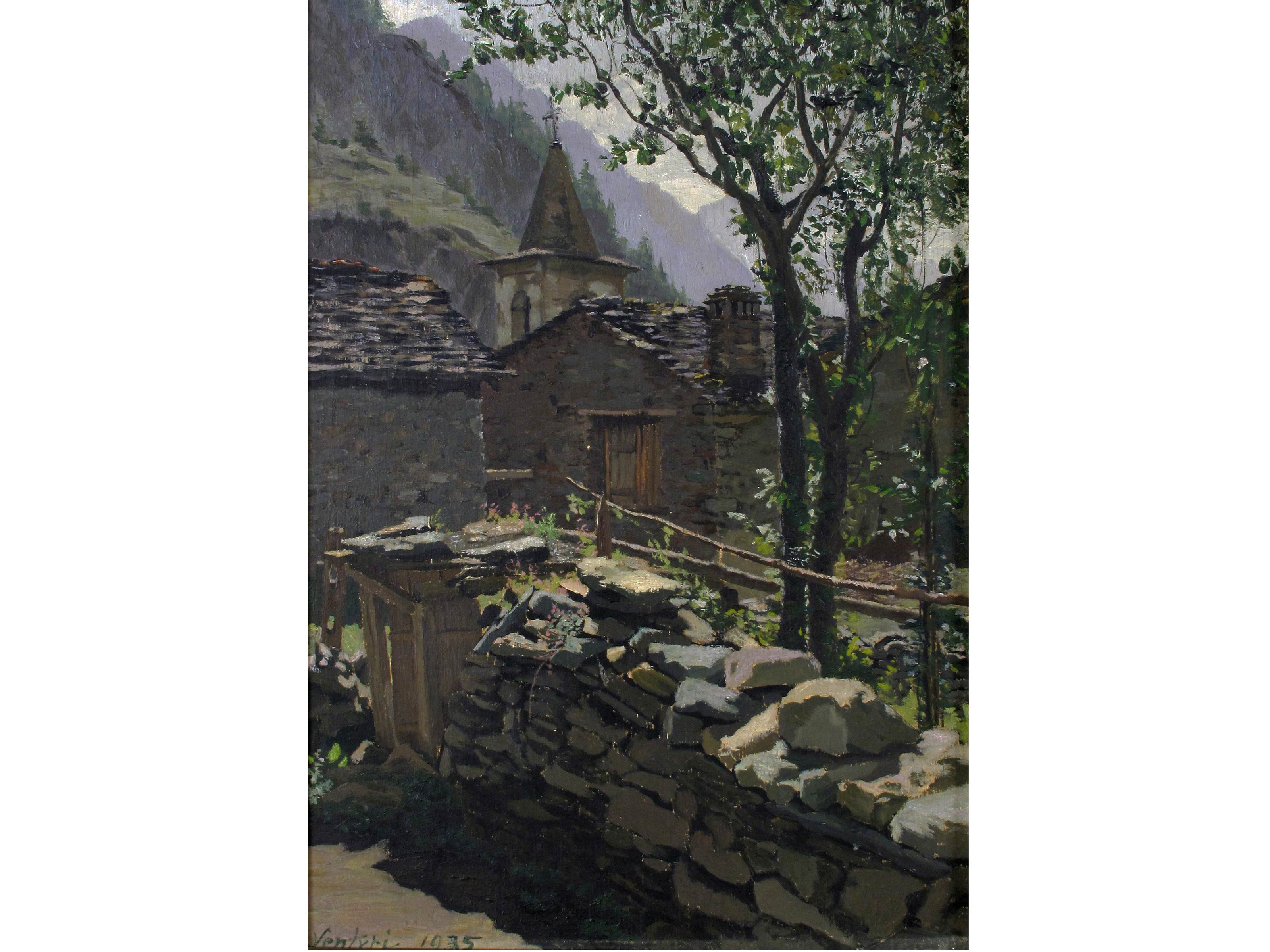 G. Venturi (XX secolo) Scorcio di paese Olio su tavoletta Firmato Datato 1935 Misure 38x27,5 cm