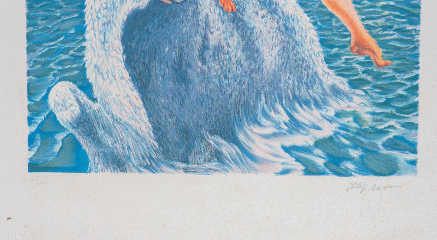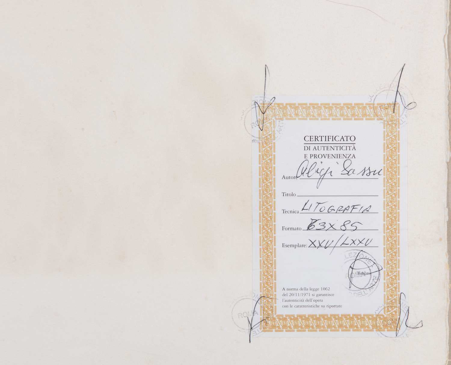 Litografia a colori su carta, firmata in basso a destra Aligi Sassu, numero di tiratura XXV/LXXV, reca timbro a secco Graphis Arte - Livorno e altro timbro a secco, al retro certificato di autenticità e provenienza, Foglio 87x63 - Lastra h cm 70x51.5