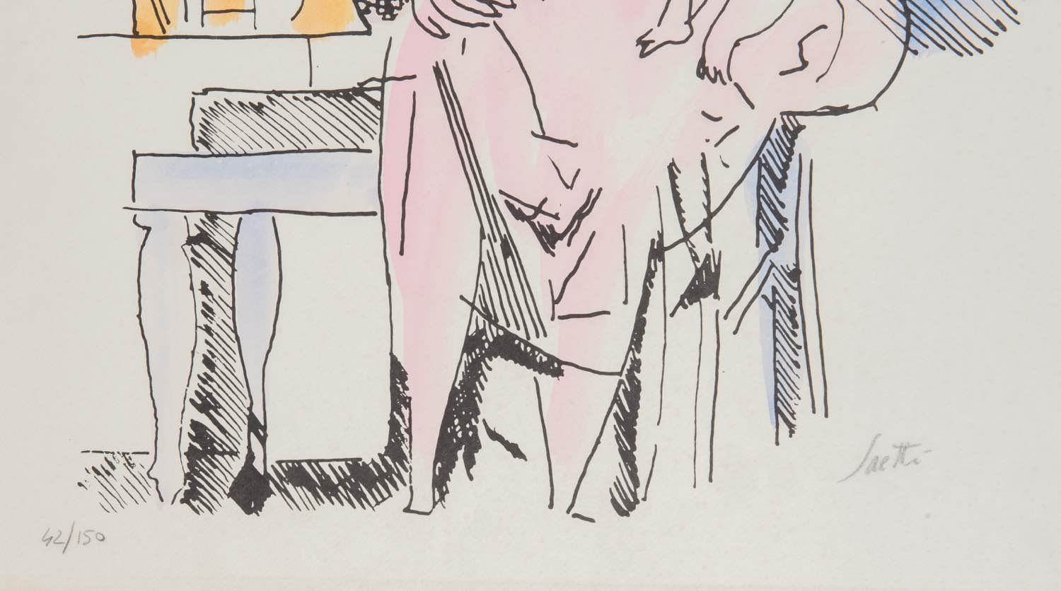 Litografia a colori su carta, firmata in basso a destra Saetti, numero di tiratura in basso a sinistra 42/150, H cm 70x50