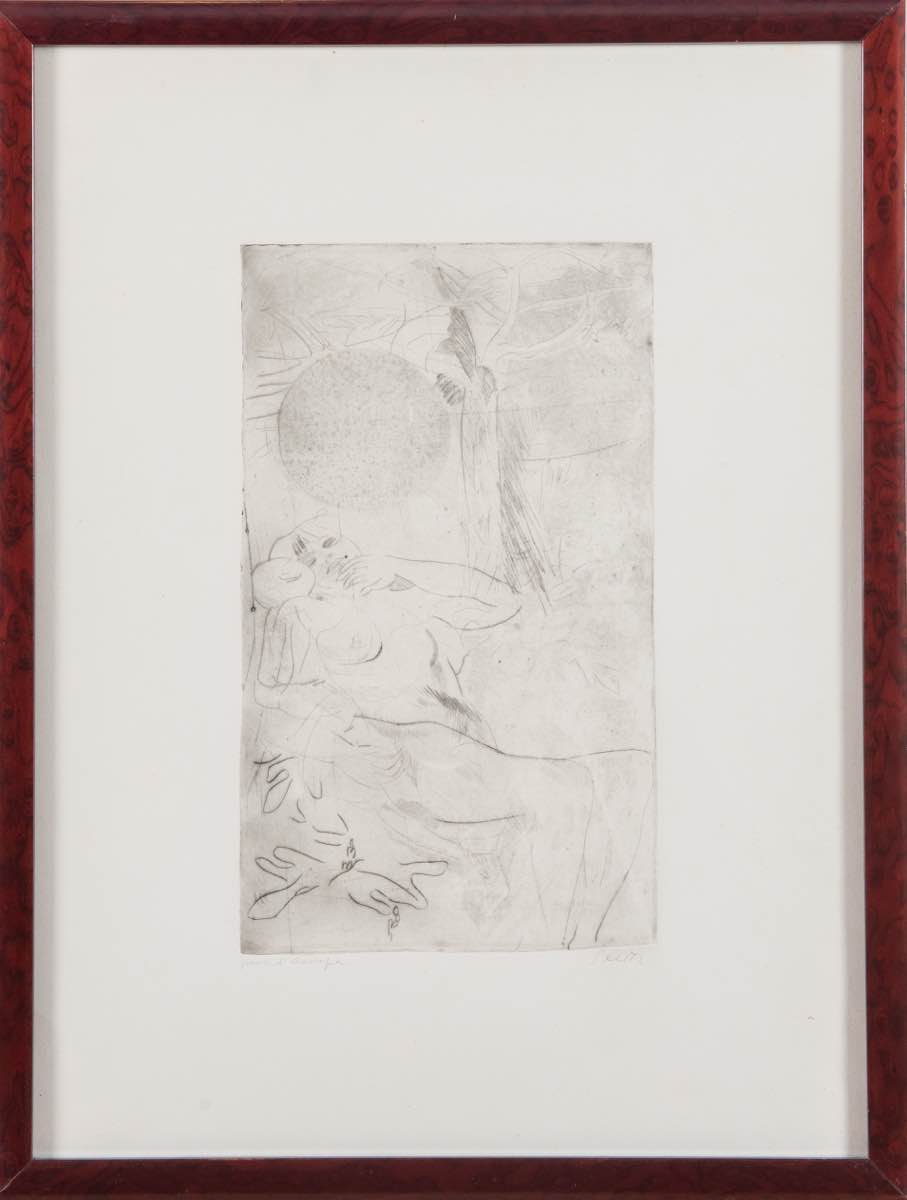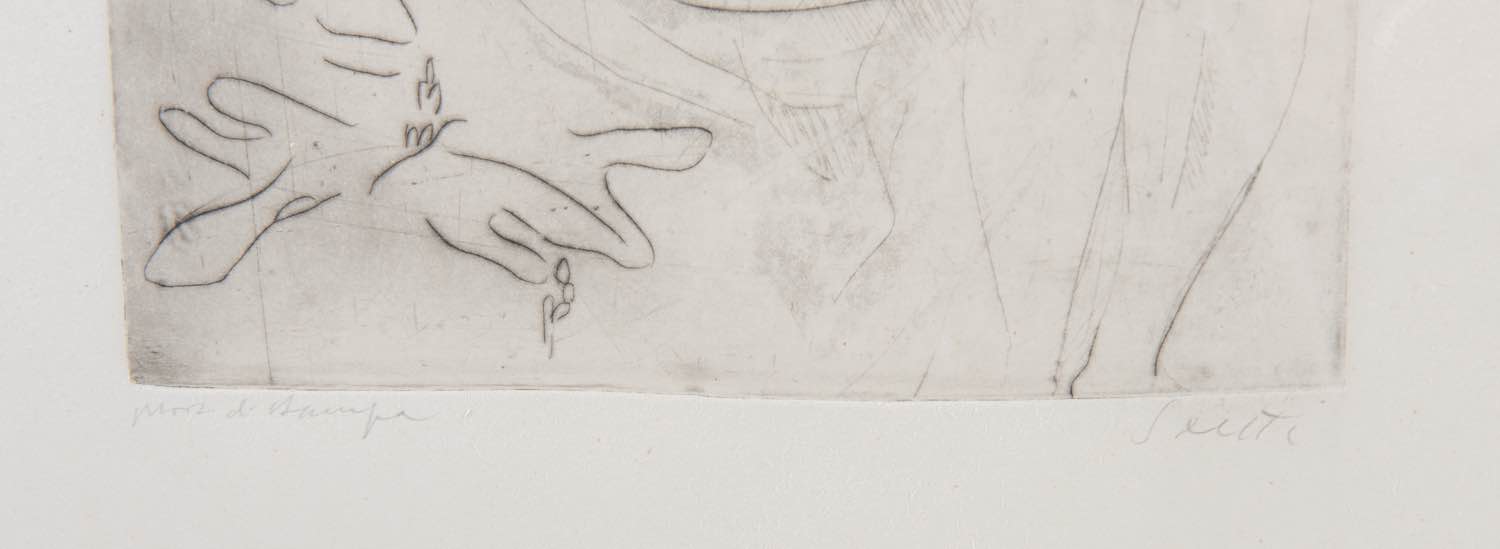 Acquaforte su carta, firmata in basso a destra Saetti, esemplare in basso a sinistra prova di stampa, Lastra H cm 34.5x20
