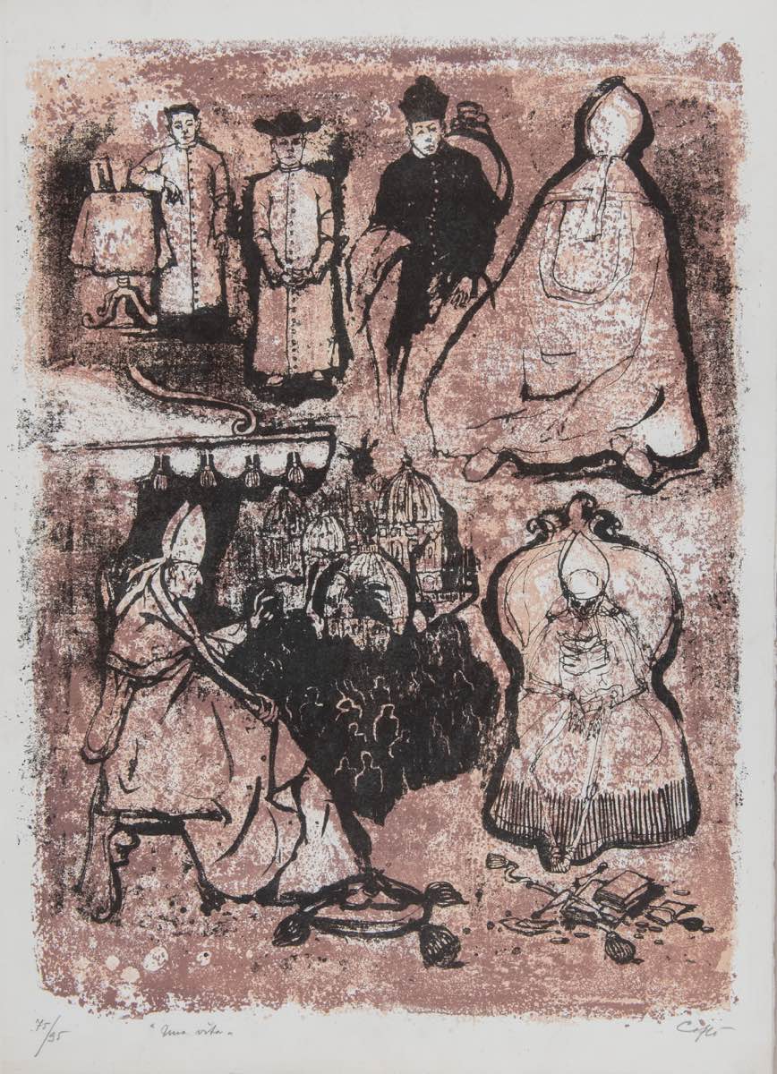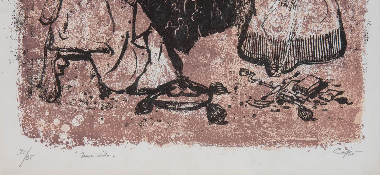 Litografia su carta, firmata in basso a destra Caffè, numero di tiratura e titolo in basso a sinistra 75/95 Una vita, H cm 70x51