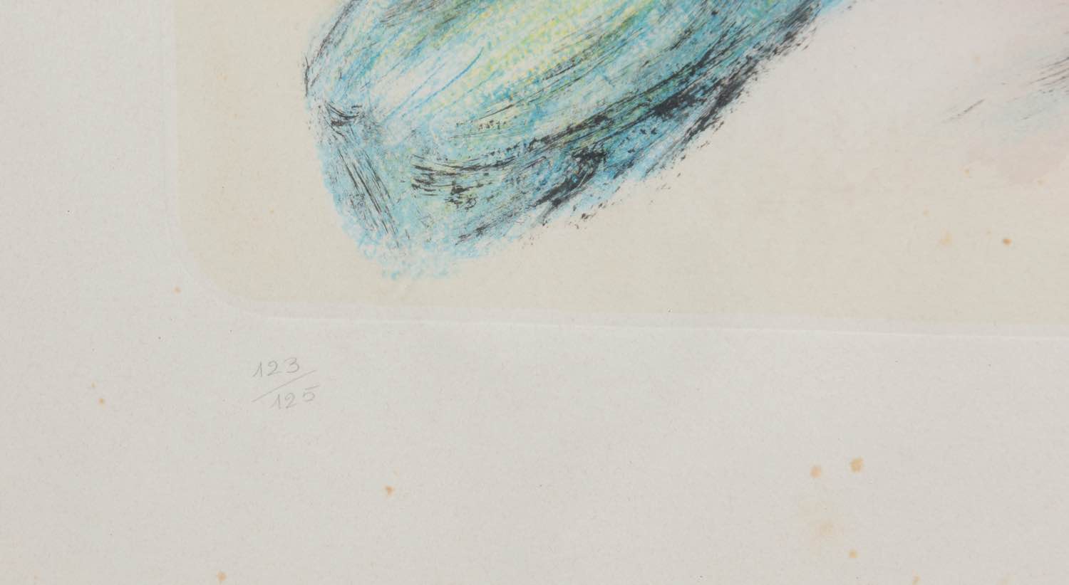 Litografia a colori su carta, firmata in basso a destra Purificato, numero di tiratura in basso a sinistra 123/125, Foglio H cm 68.5x49 - Lastra H cm 45x35