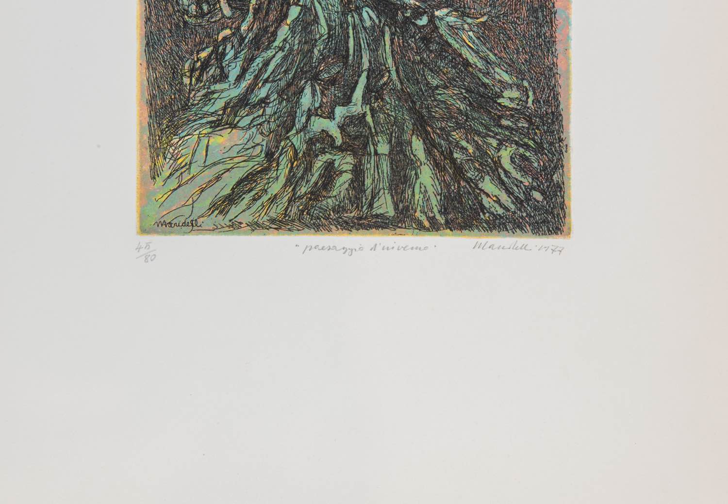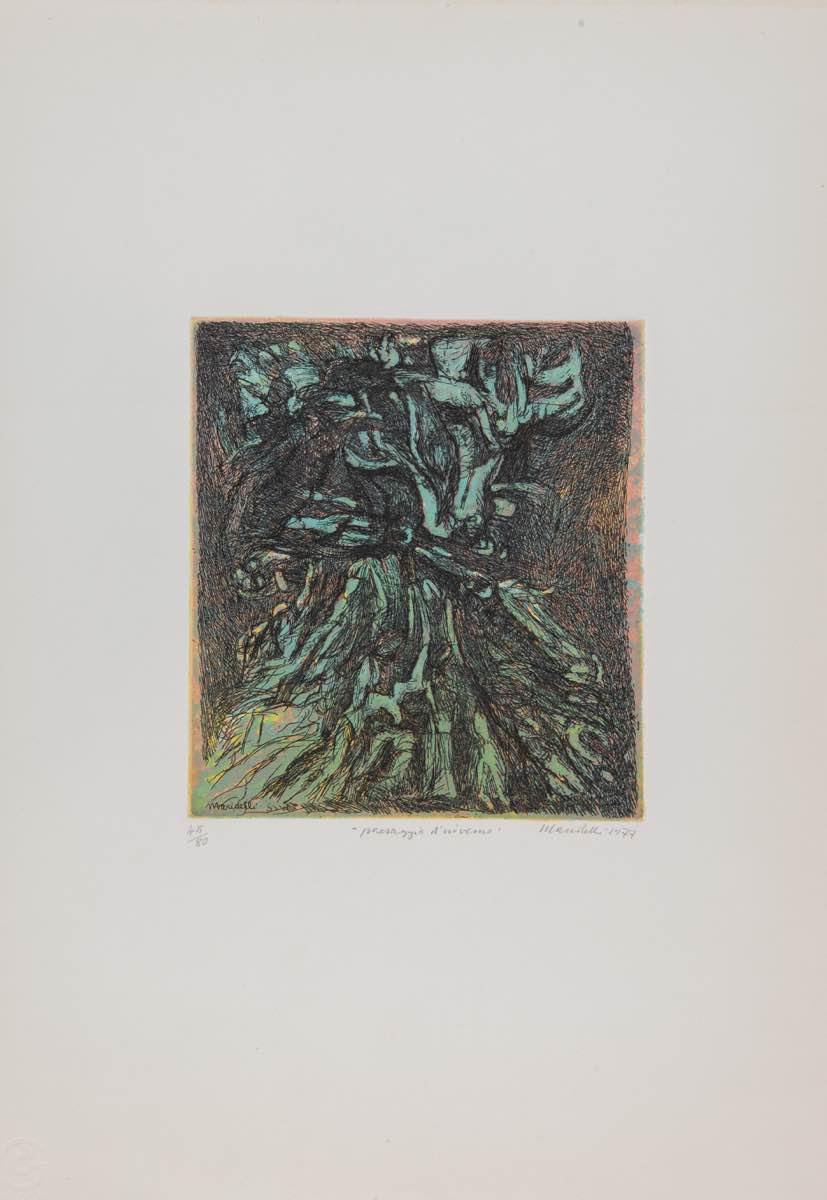 Acquaforte acquatinta a cinque colori, firmata e datata in basso a destra Mandelli 1977, al centro titolo Paesaggio d’inverno, numero di tiratura in basso a sinistra 45/80, Lastra H cm 20x19