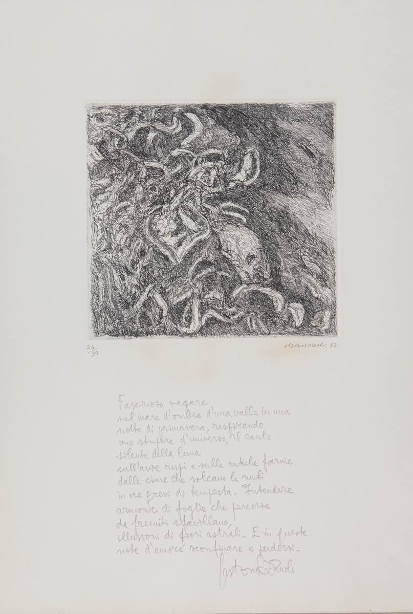 Litografia su carta, firmata e datata in basso a destra Mandelli 82, numero di tiratura in basso a sinistra 24/30, il foglio reca in basso poesia, Lastra H cm 19x20