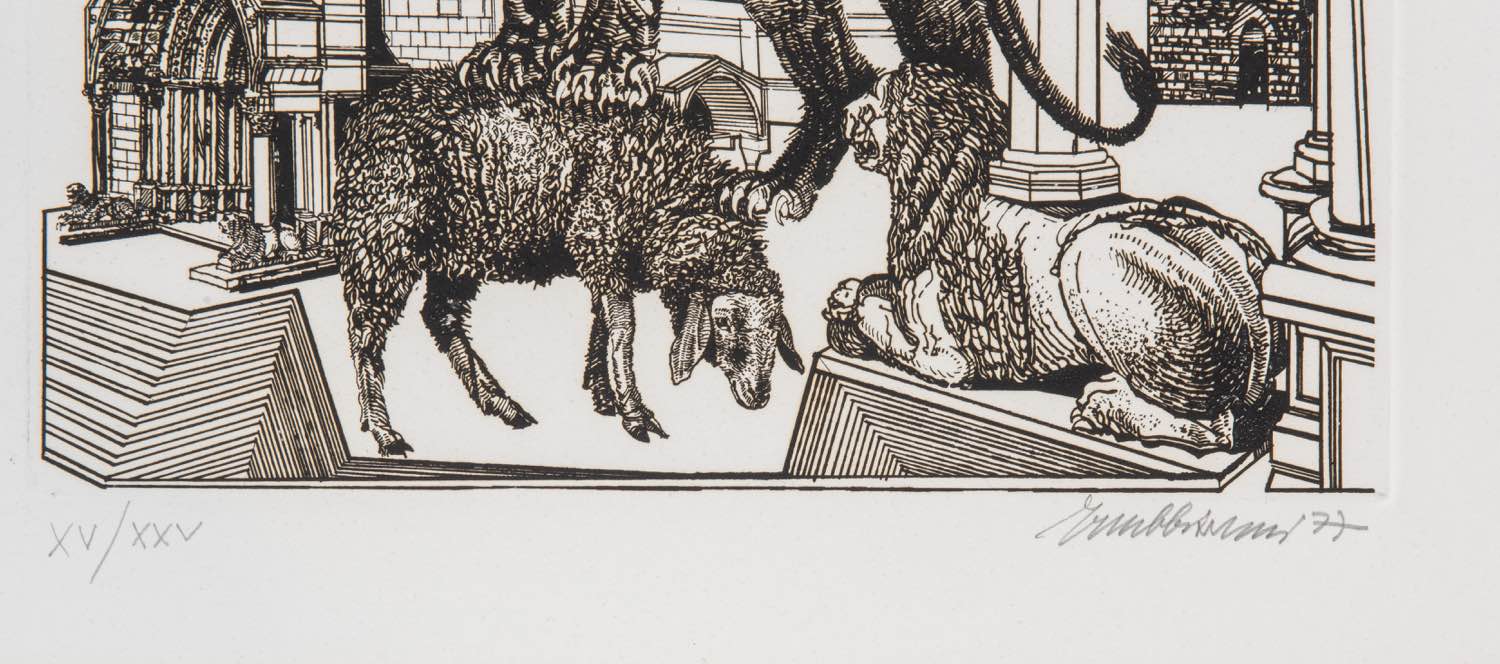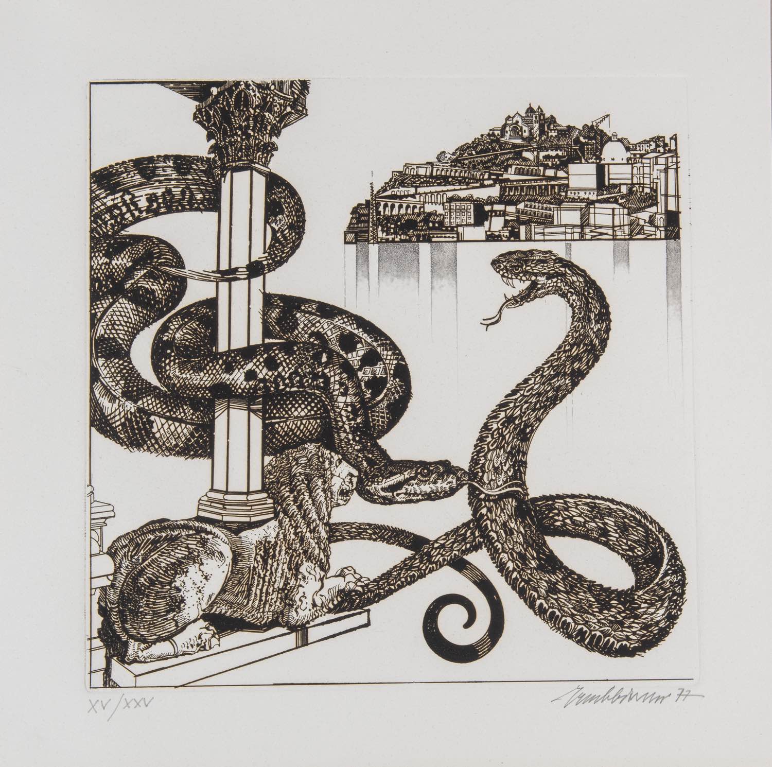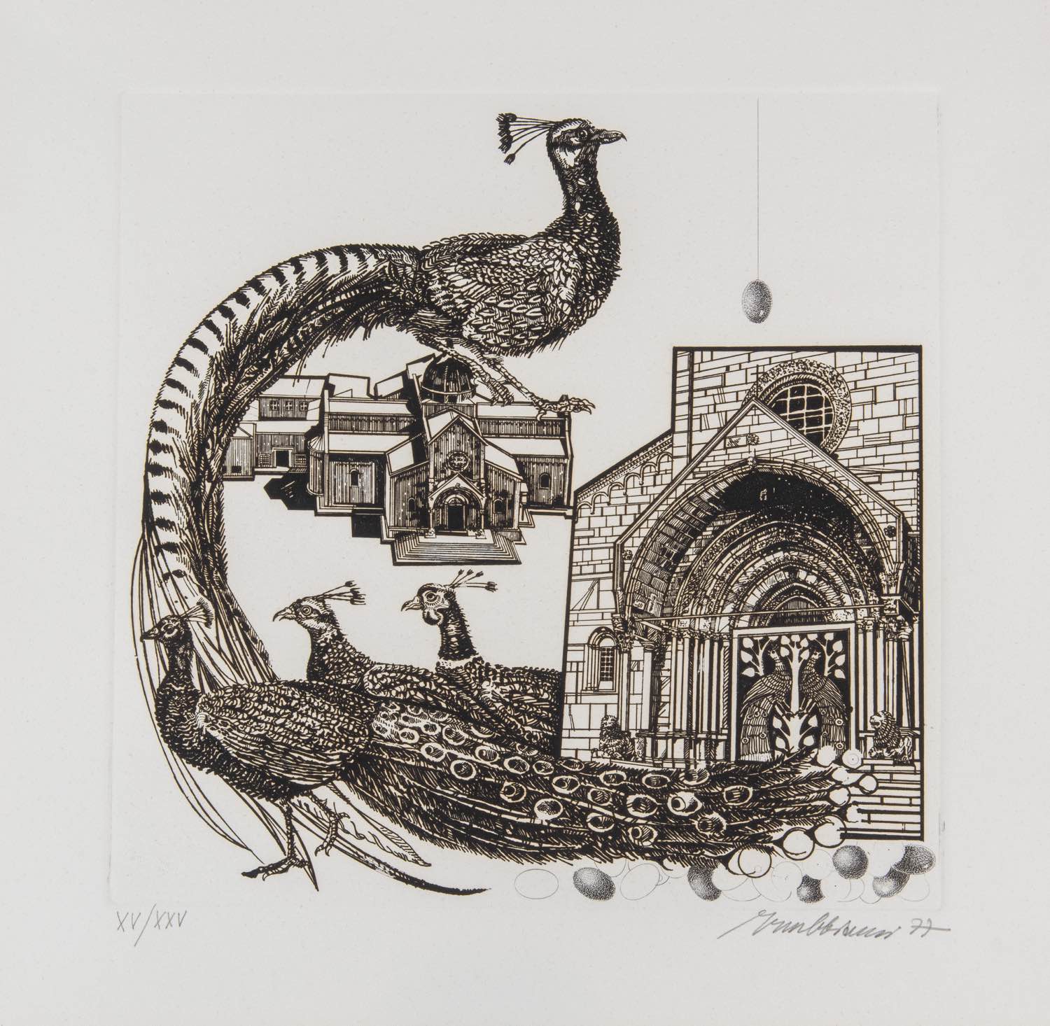 Cartellina artistica, copia numero XV, contenente tre acqueforti, edizione L’Astrogallo - Ancona, H cm 44x44