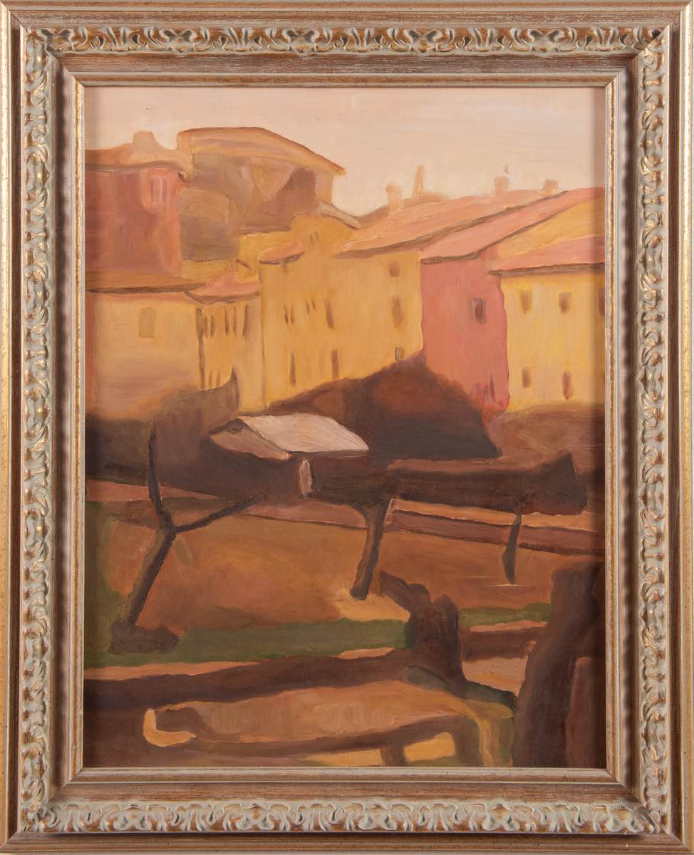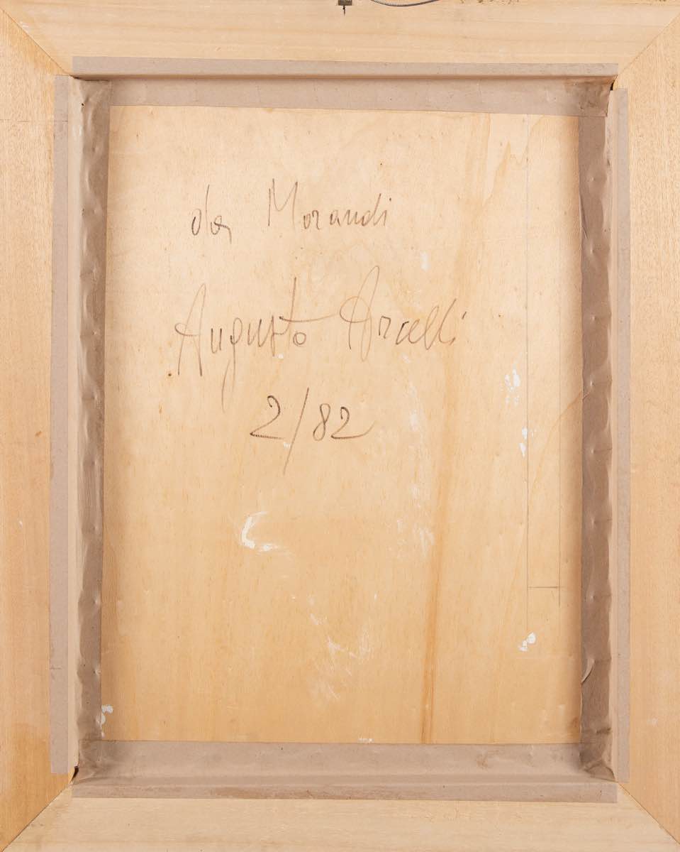 Olio su tavola, reca al retro titolo De Morandi, firma Augusto Arcelli e data 2/82, H cm 62x48