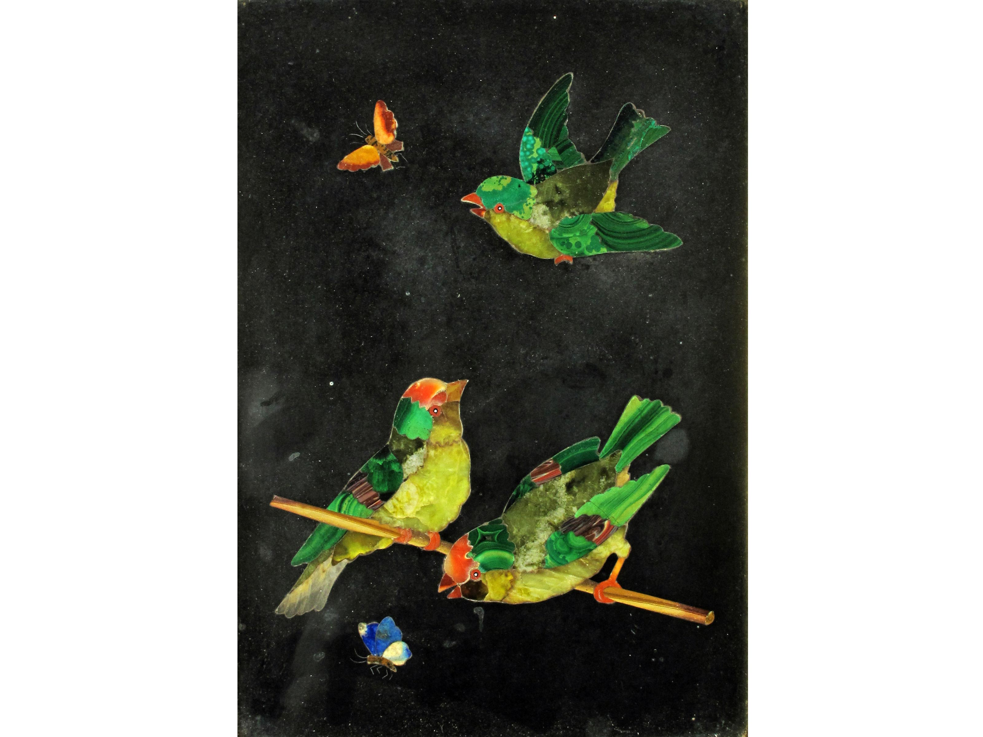 Commesso in pietre colorate Inizio XX secolo Uccellini e farfalle Misure 20,5x14,5 cm