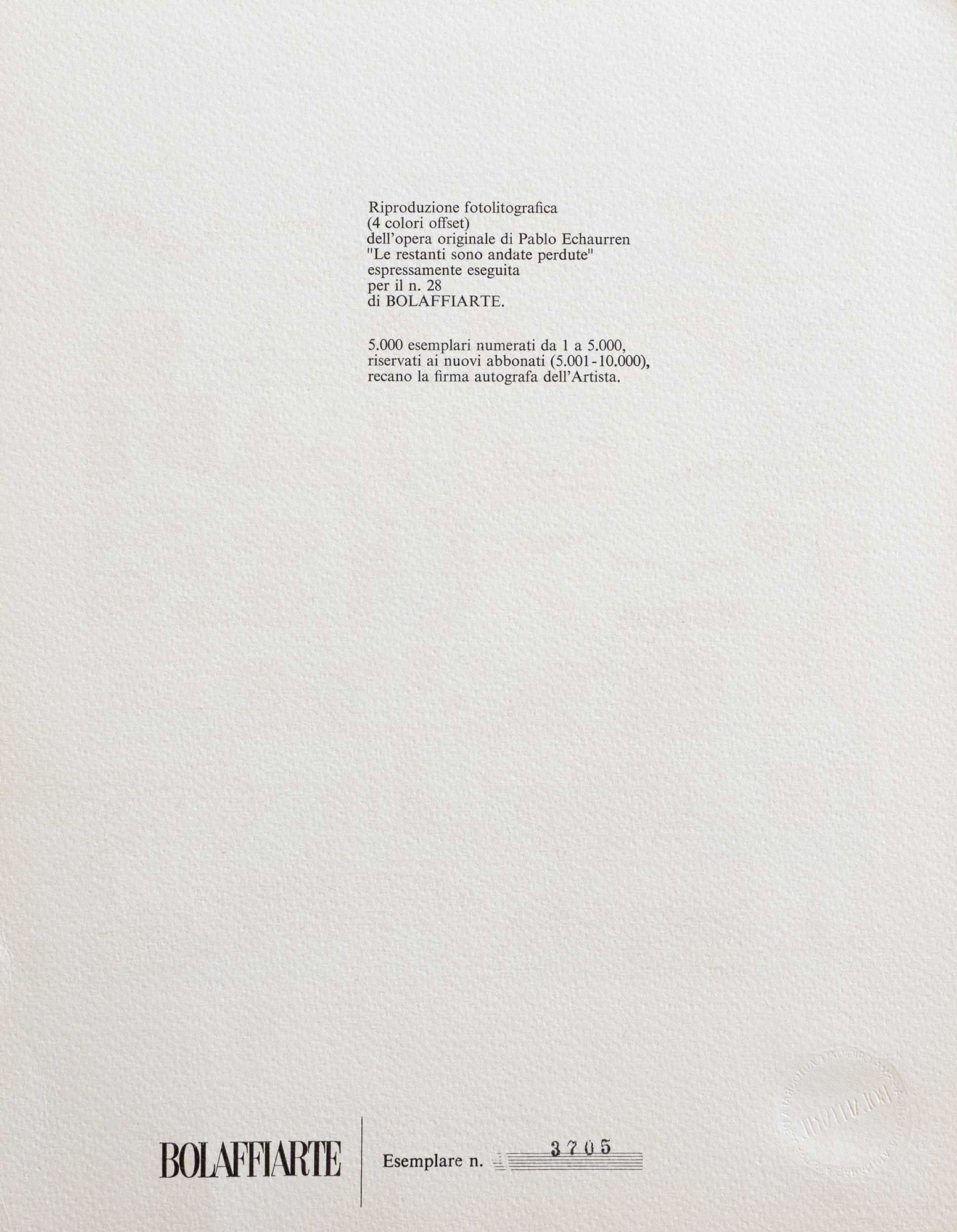 BOLAFFIARTE è stata una rivista di cultura voluta dagli editori Giorgio Bolaffi e Mondadori con lo scopo di fornire diverse informazioni ed approfondimenti su artisti italiani ed esteri. Con cadenza mensile, ogni numero proponeva visite agli atelier d'artista o collezioni pubbliche o ancora visite ai musei. La panoramica offerta da Giorgio Bolaffi includeva sia artisti affermati che emergenti. Spesso con l'acquisto della rivista il lettore trovava tavole sciolte in supplemento, come quelle che proponiamo noi in catalogo.