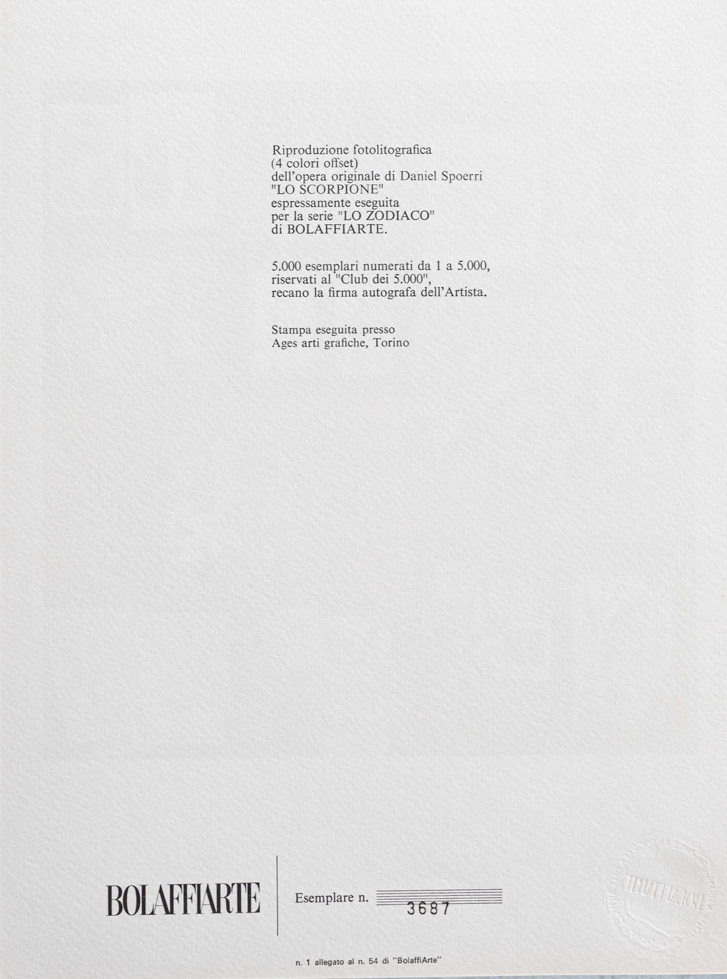 Daniel Spoerri, Lo Scorpione eseguita per la serie 'LO ZODIACO DI BOLAFFIARTE'