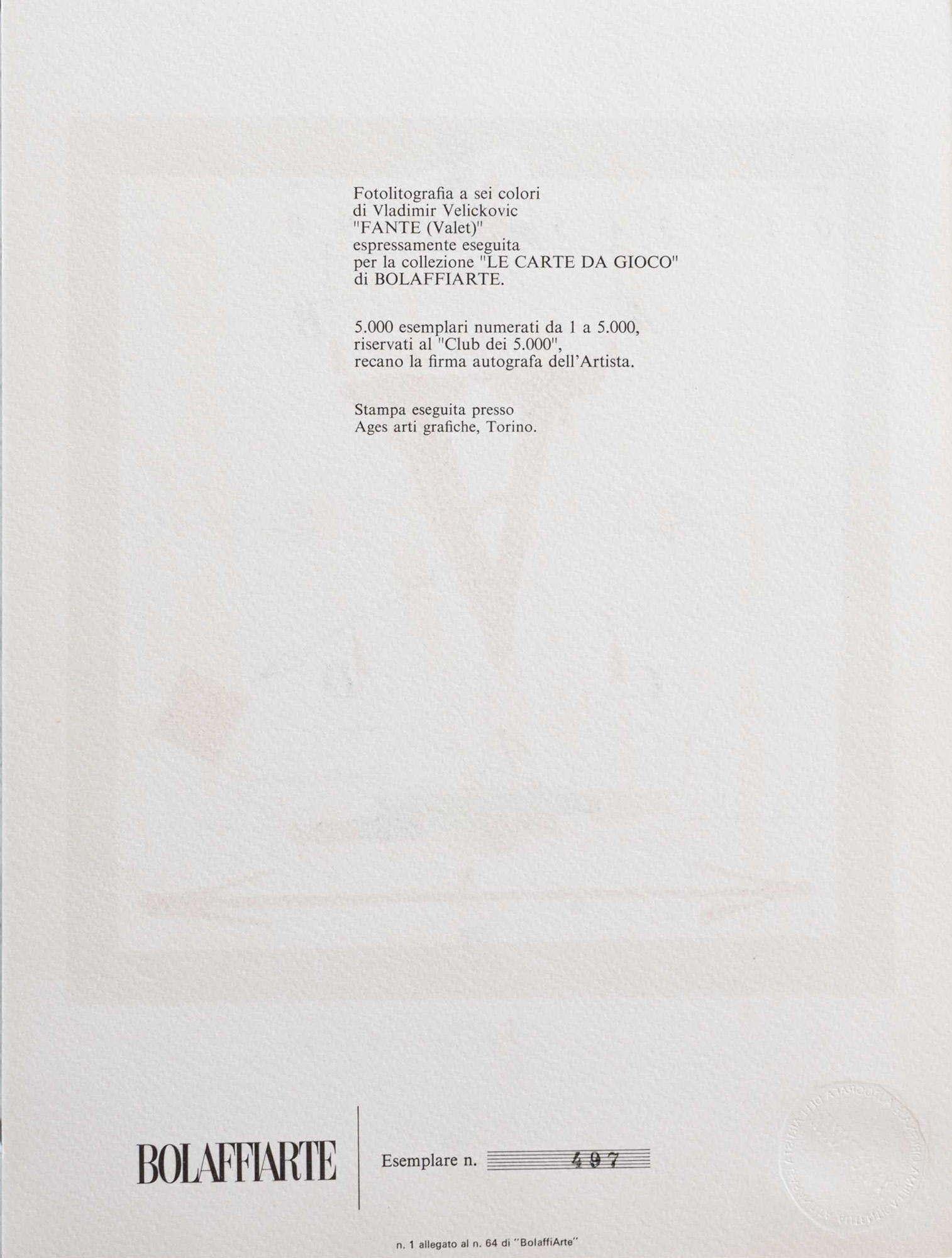 riproduzione fotolitografica. Esemplare n. 497/5000