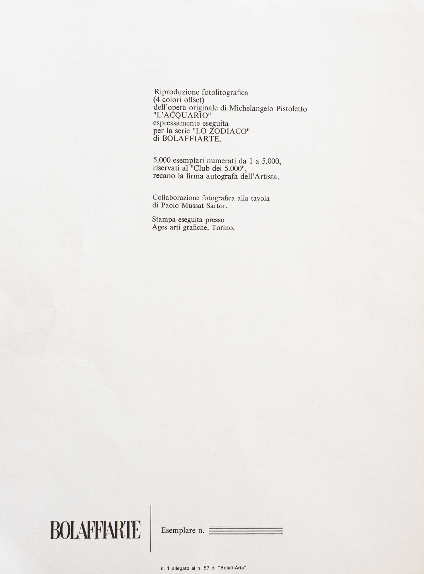 Michelangelo Pistoletto,L'Acquario eseguita per la serie 'LO ZODIACO DI BOLAFFIARTE'. Collaborazione fotografica alla tavola di Paolo Mussat Sartor, riproduzione fotolitografica, cm 29x22