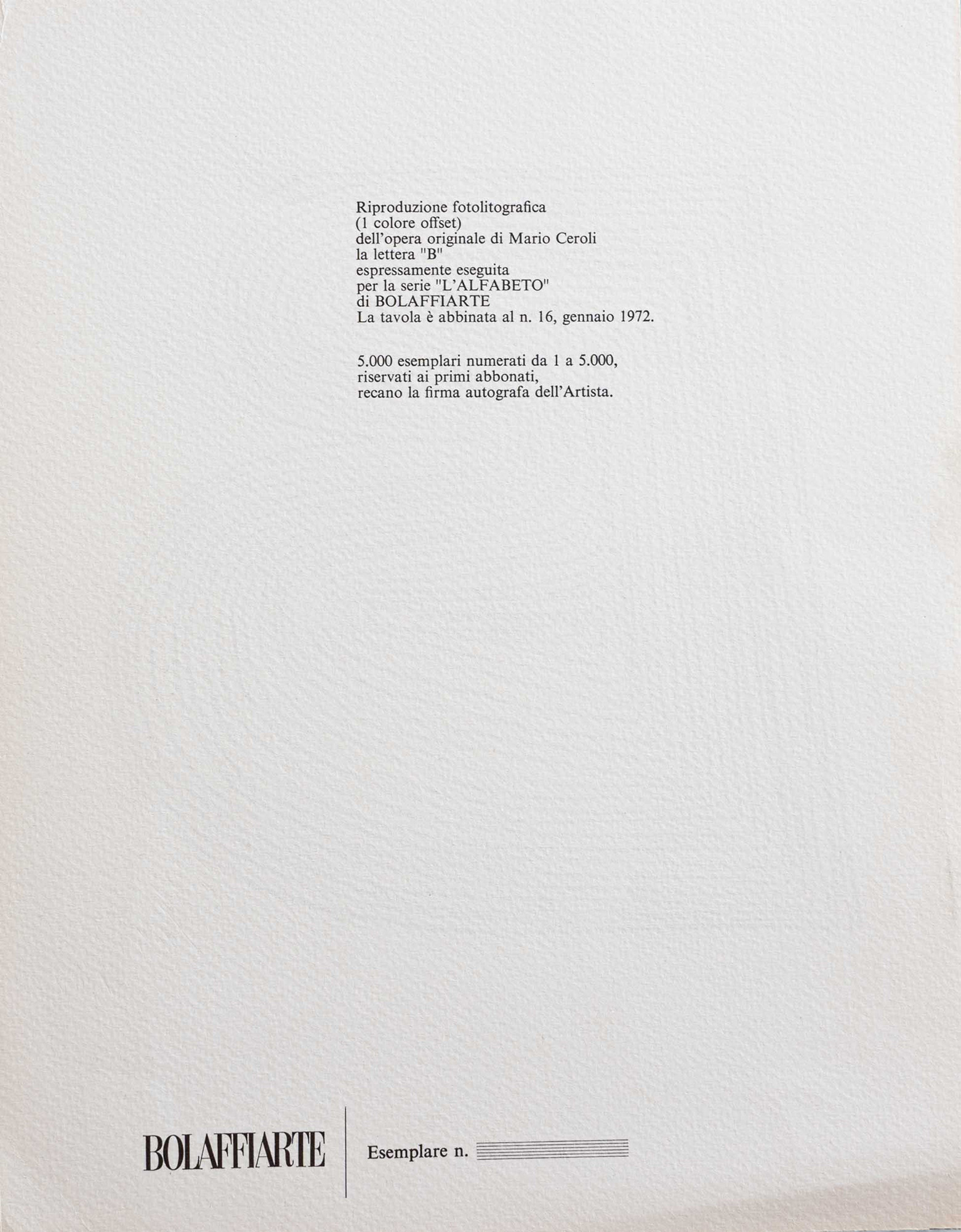 Mario ceroli, Lettera 'B' eseguita per la serie 'L'ALFABETO DI BOLAFFIARTE'. riproduzione fotolitografica, cm 30,5x24,5