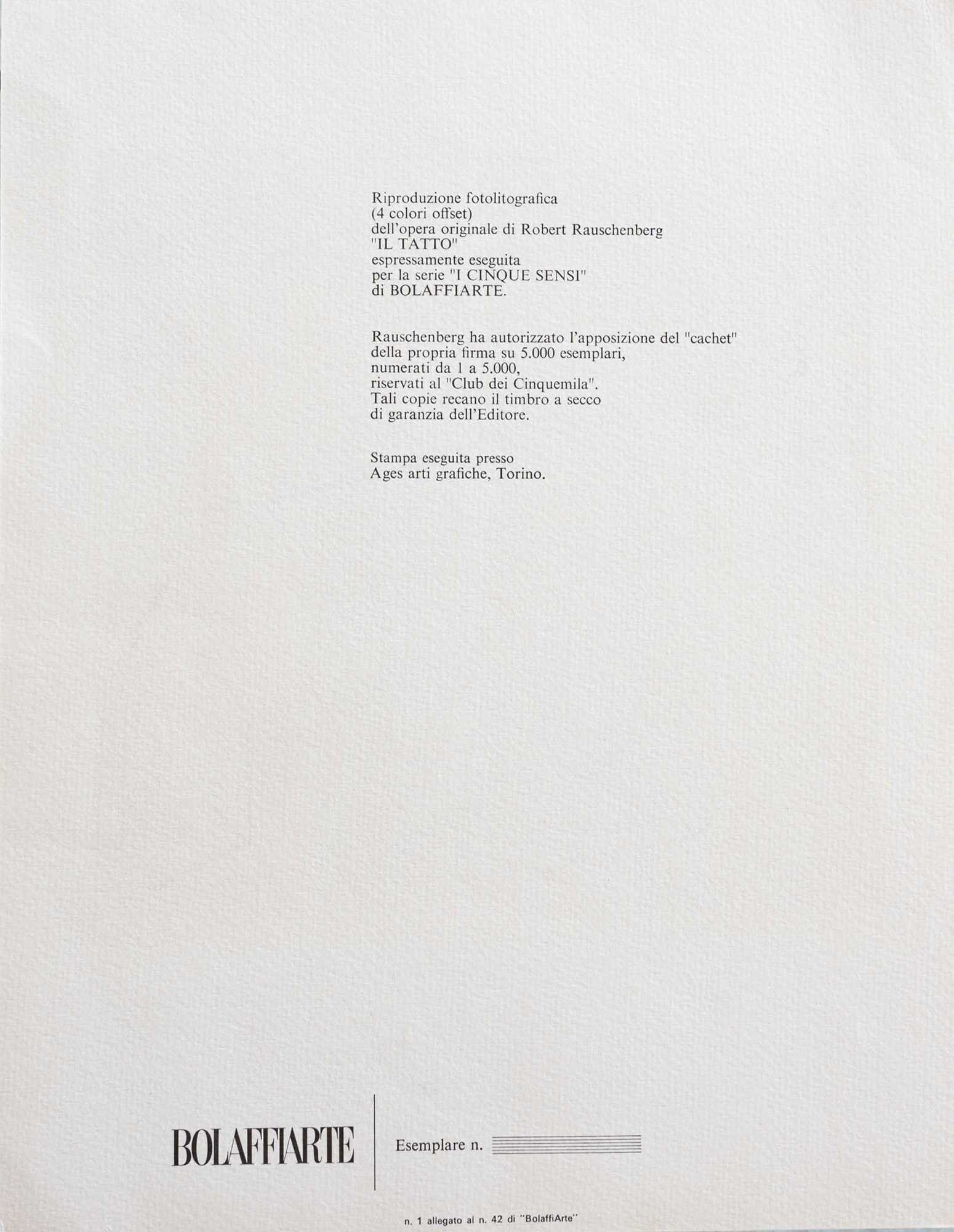 Robert Rauschenberg, Il Tatto eseguita per la serie 'I CINQUE SENSI DI BOLAFFIARTE'.riproduzione fotolitografica, cm 30,5x24,5